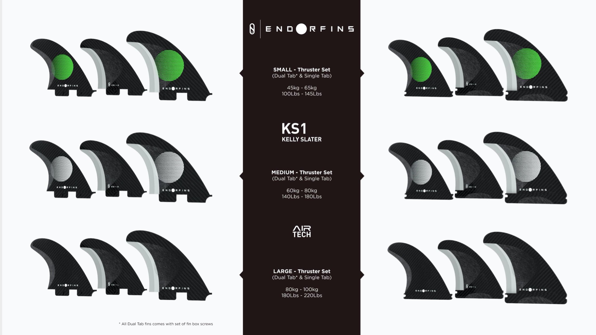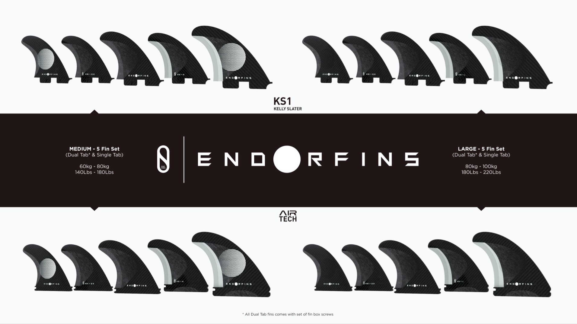 そんなENDORFINは、Kelly Slaterがデザインを手がけたスラスター(トライフィン)のスモール、ミッディアム、ラージに加えて5フィンのミディアムとラージの全5タイプのプロダクトが、FCSllとFuture用共に揃ってラインナップ。