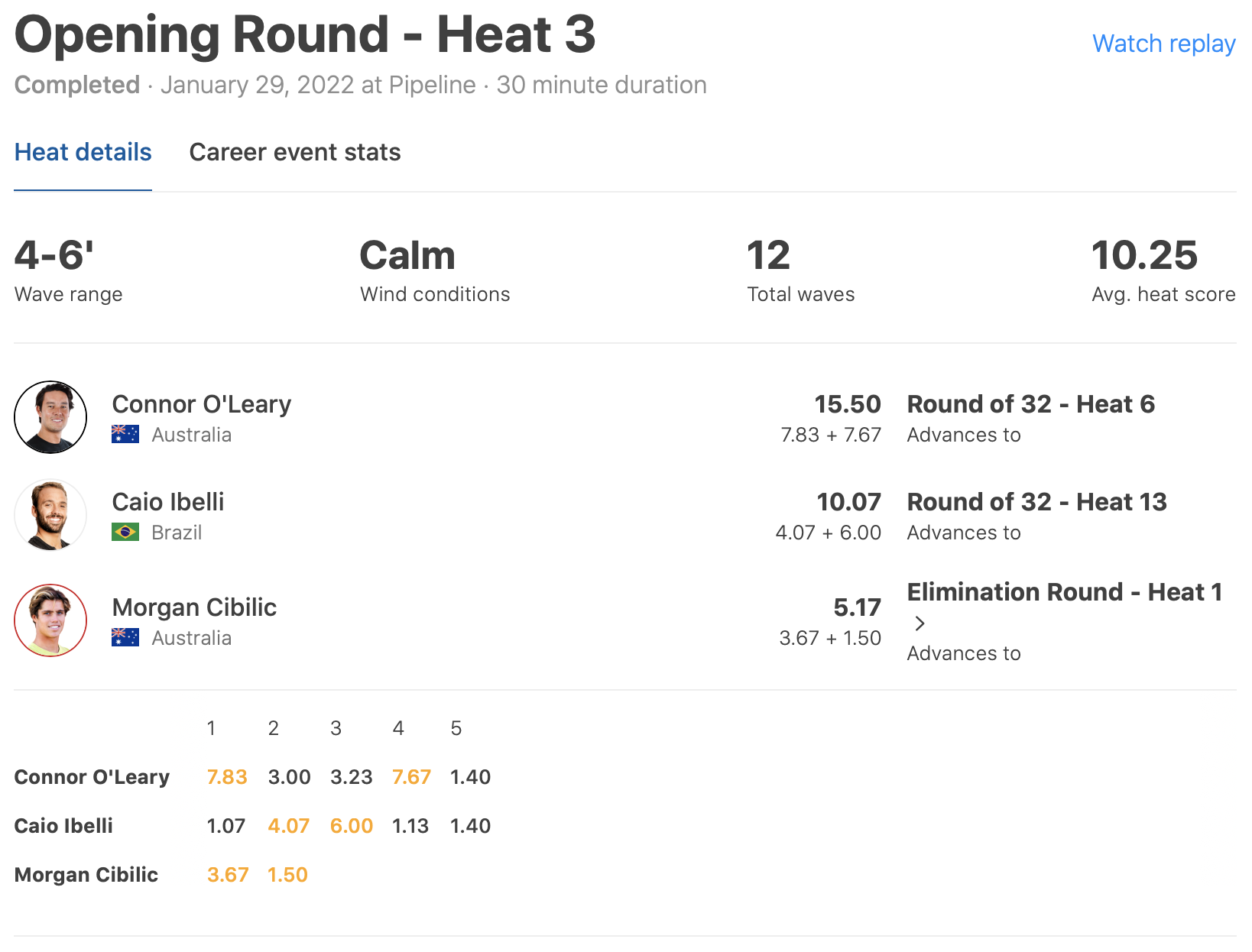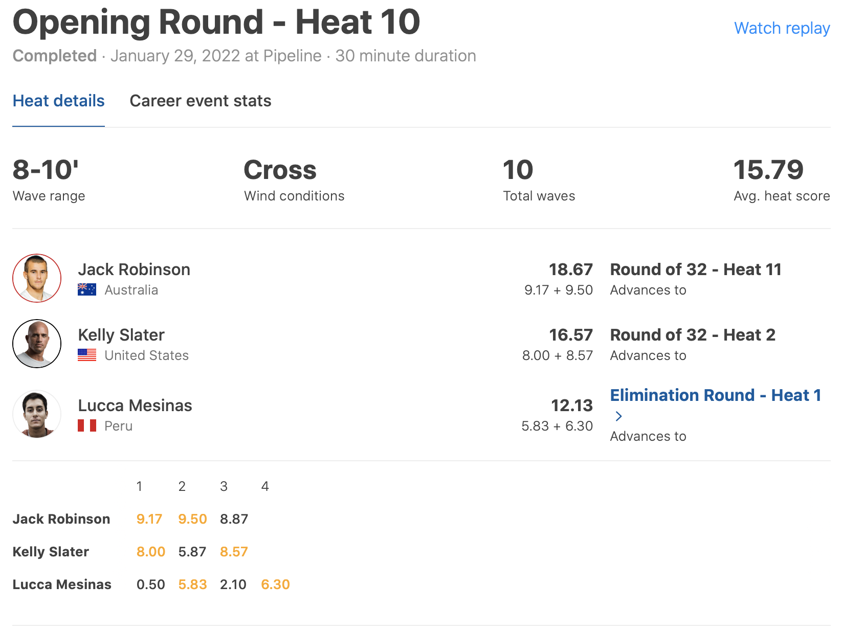 オープニングライドからパイプでスタンディング・チューブを決めて7.83ptを叩き出し、さらに掴んだ4本目の波では7.67ptをまとめ、ヒート前半で流れを掴む。