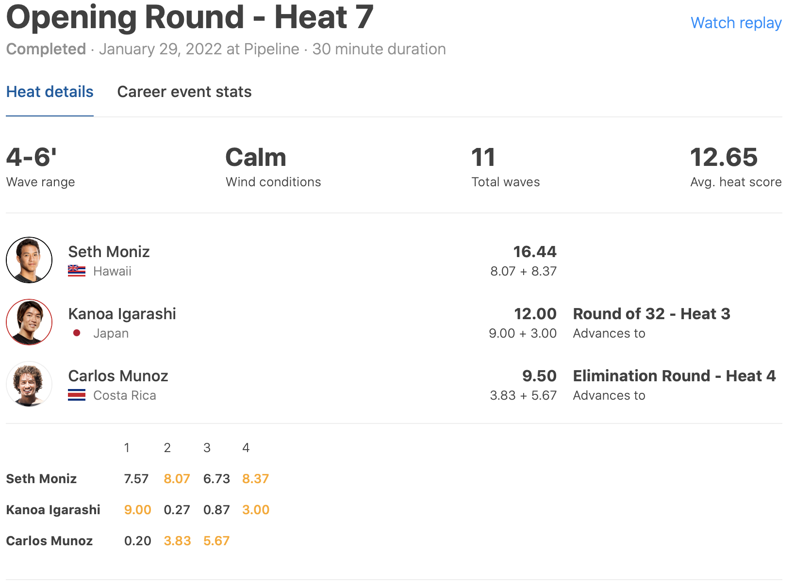 さらに日の丸を背負って世界と戦う五十嵐カノアはヒート7でSeth MonizとルーキーCarlos Munozと対戦。