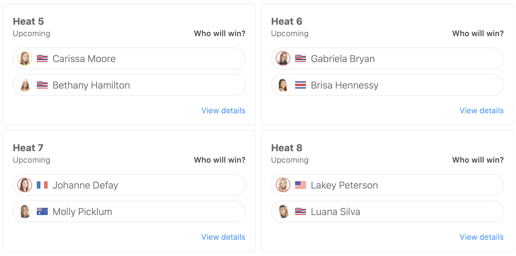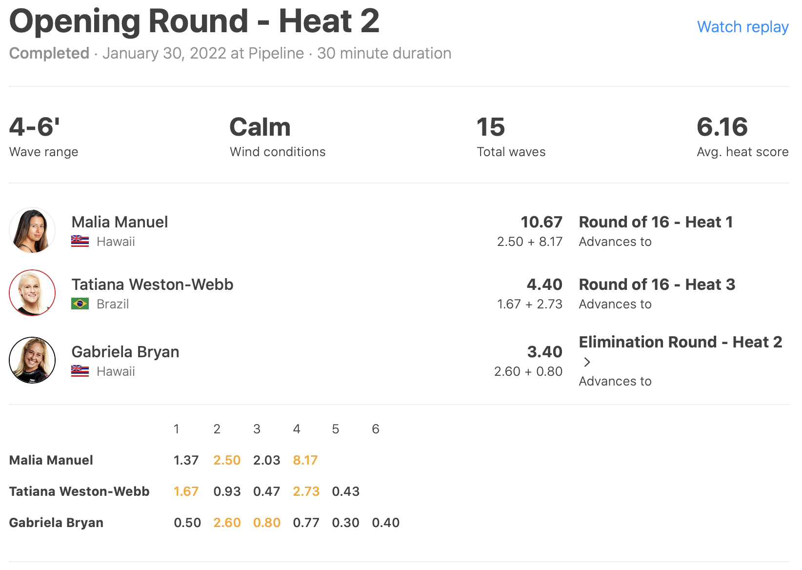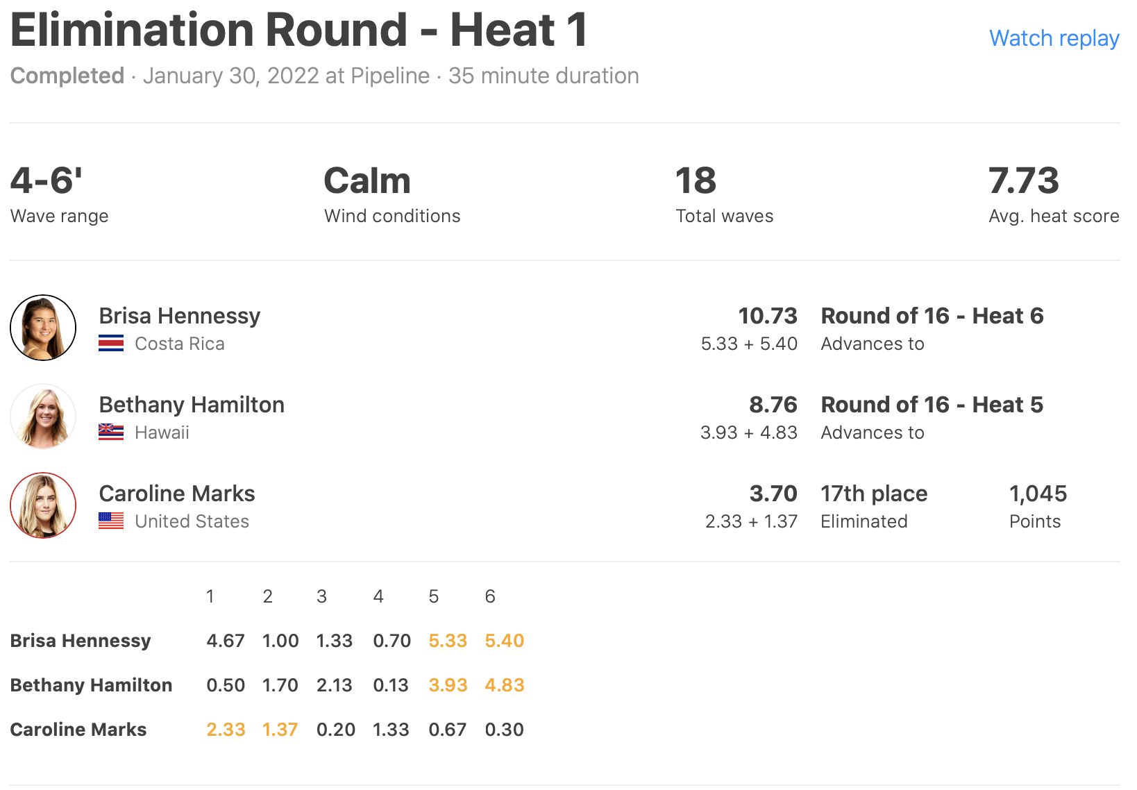その一方で、敗者復活戦となるイリミネーション・ラウンドではヒート1に出場のCaroline MarksがBrisa HennessyとBethany Hamiltonに敗退。