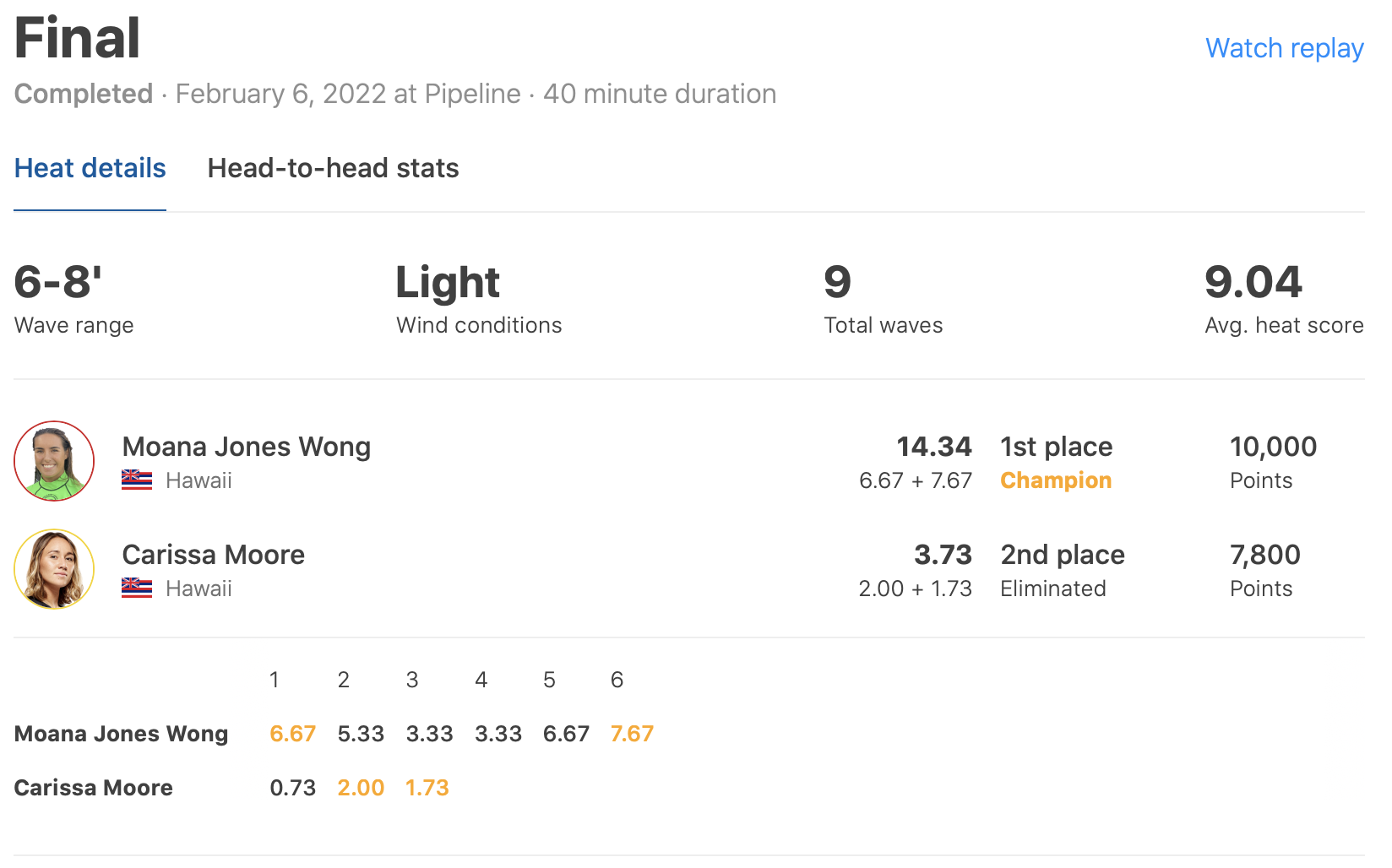 HEAT 1: Moana Jones Wong (HAW) 14.00 def. Tyler Wright (AUS) 9.76