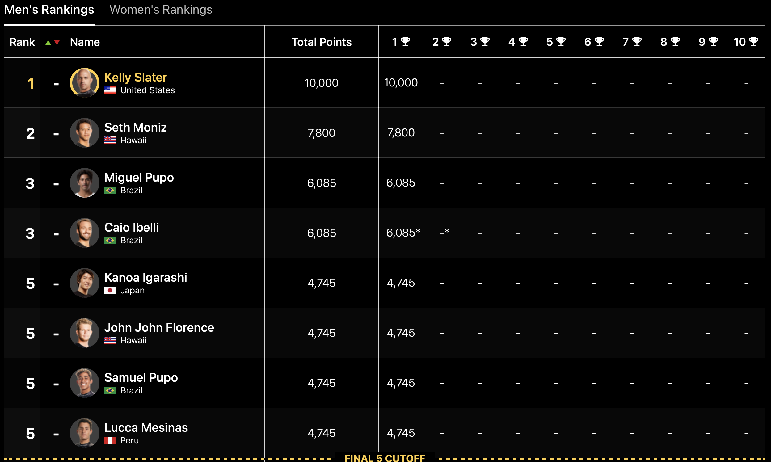五十嵐カノアはJohn John Florence、Samuel Pupo、Lucca Mesinasと並んで同率5位のポジション、Connor O’learyはGrffinn Colapinto、Frederico Morais、Jack RobinsonKolohe Andino、Devid SilvaEthan Ewing、Ezekeil Lau、Jake Marshall、Nat Youngほか総勢16名の選手たちと同率の17位となっている。
