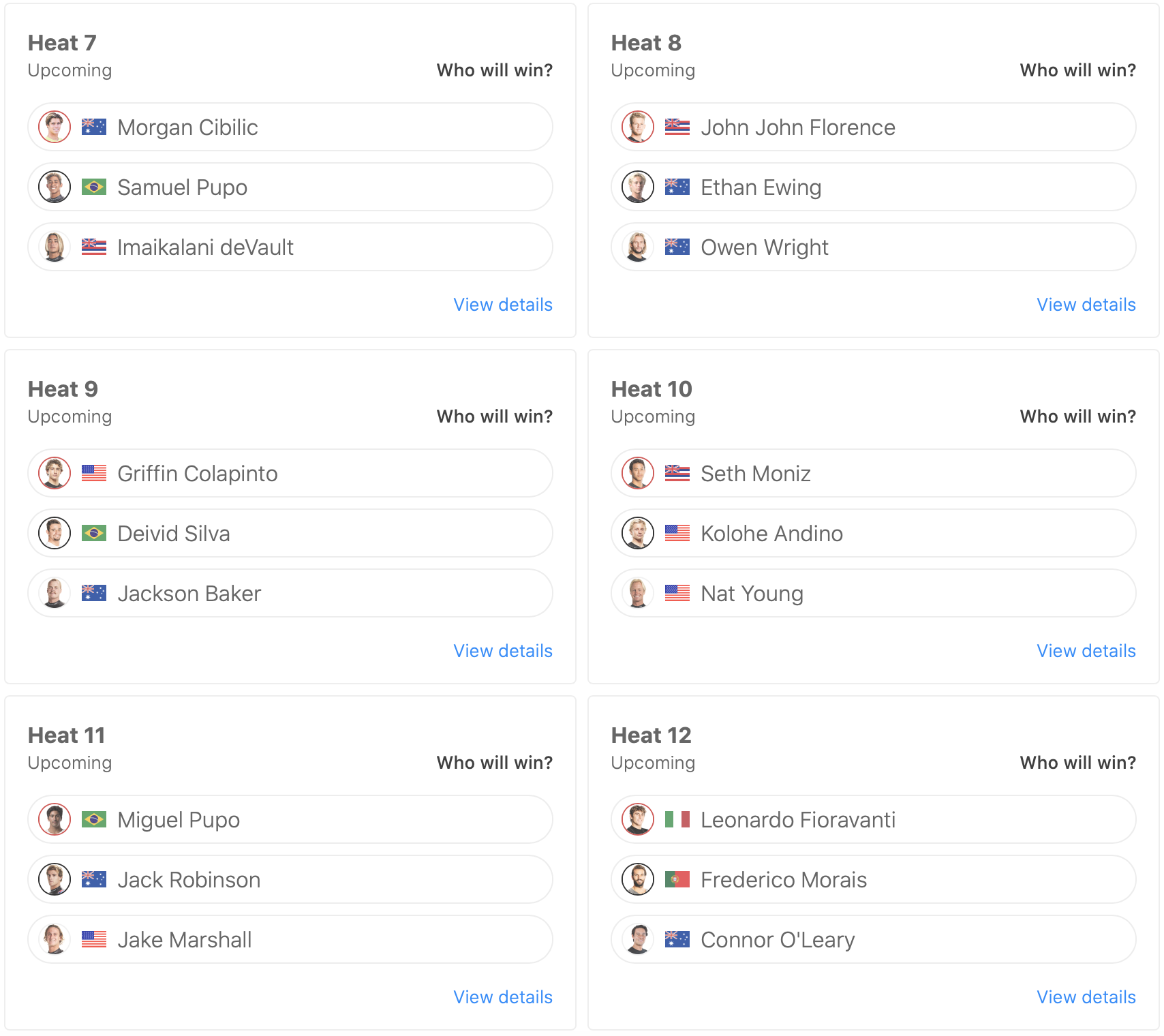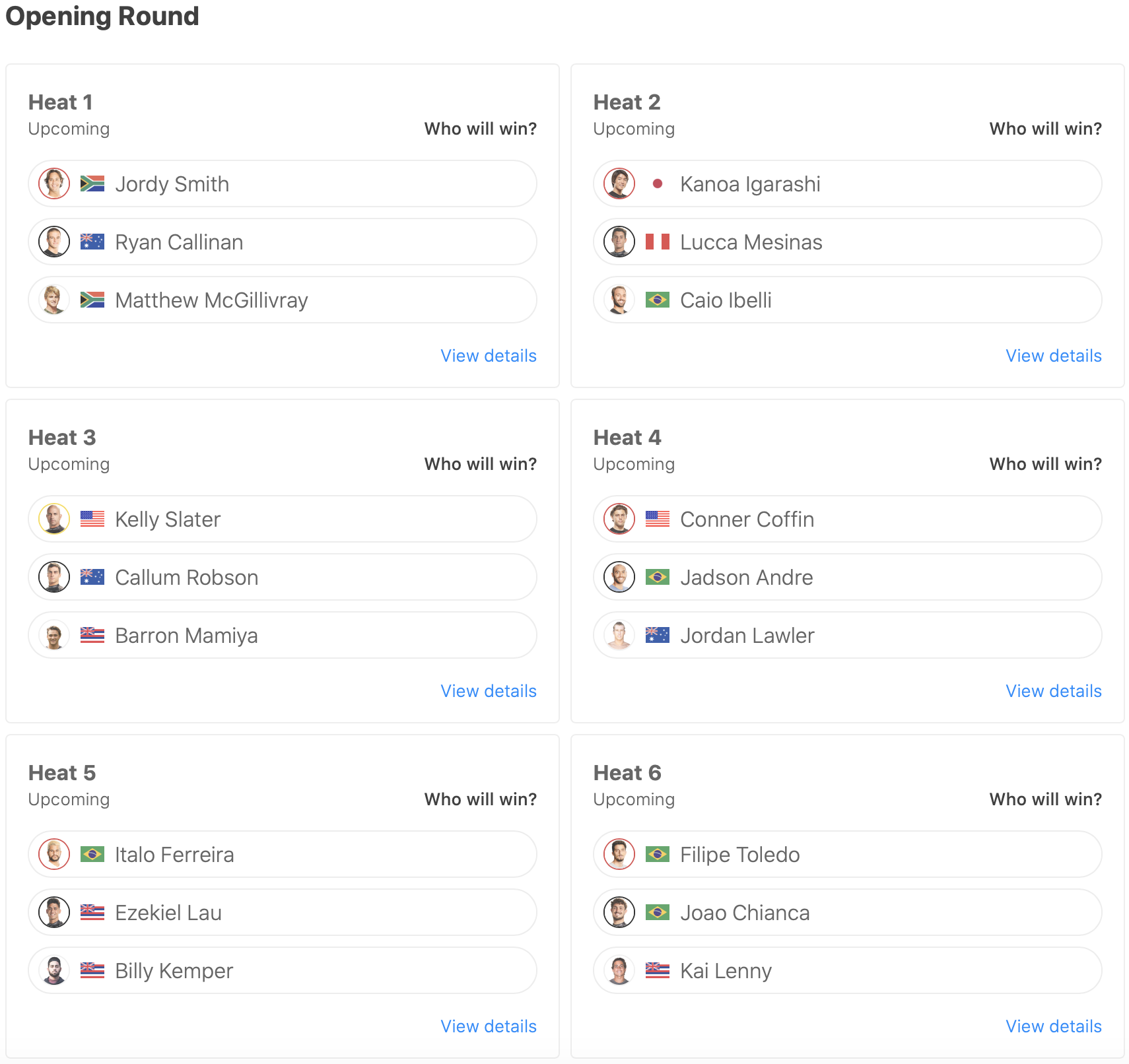 注目の五十嵐カノアはヒート2でLucca Mesinas、Caio Ibelliと、Connor O’learyはヒート12でLeonardo Fioravanti、Frederico Moraisと対戦予定となっている。
