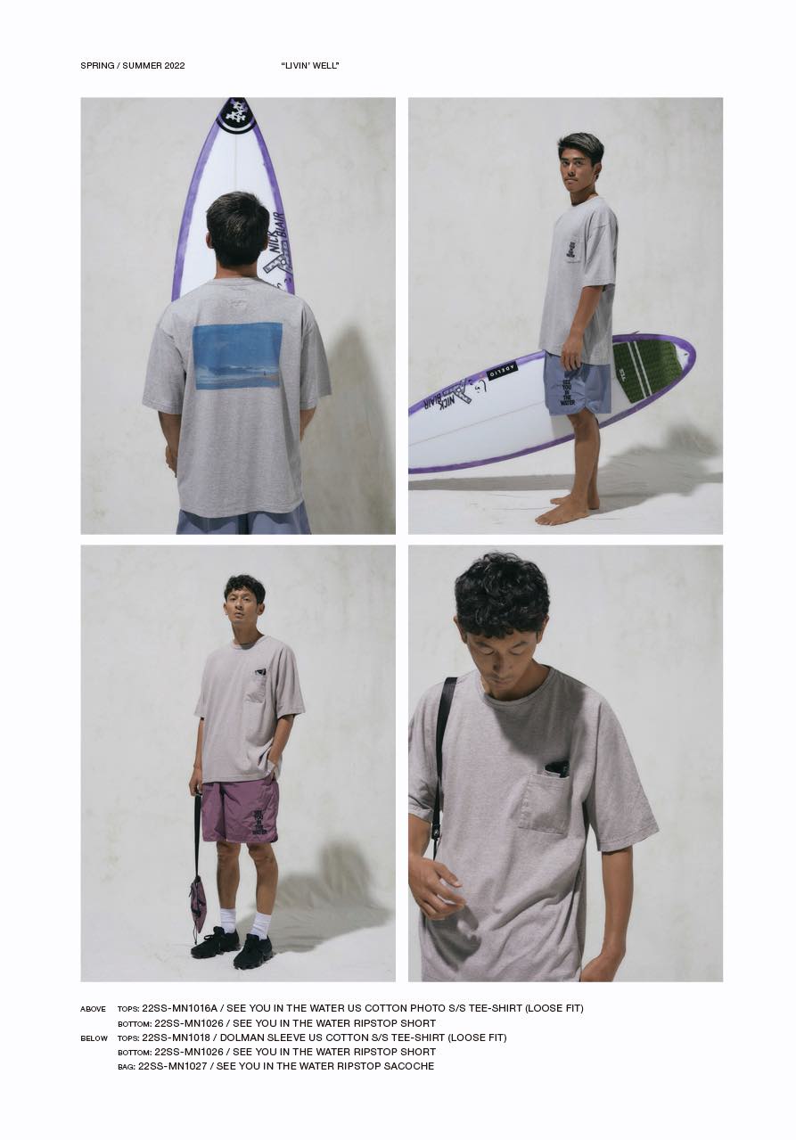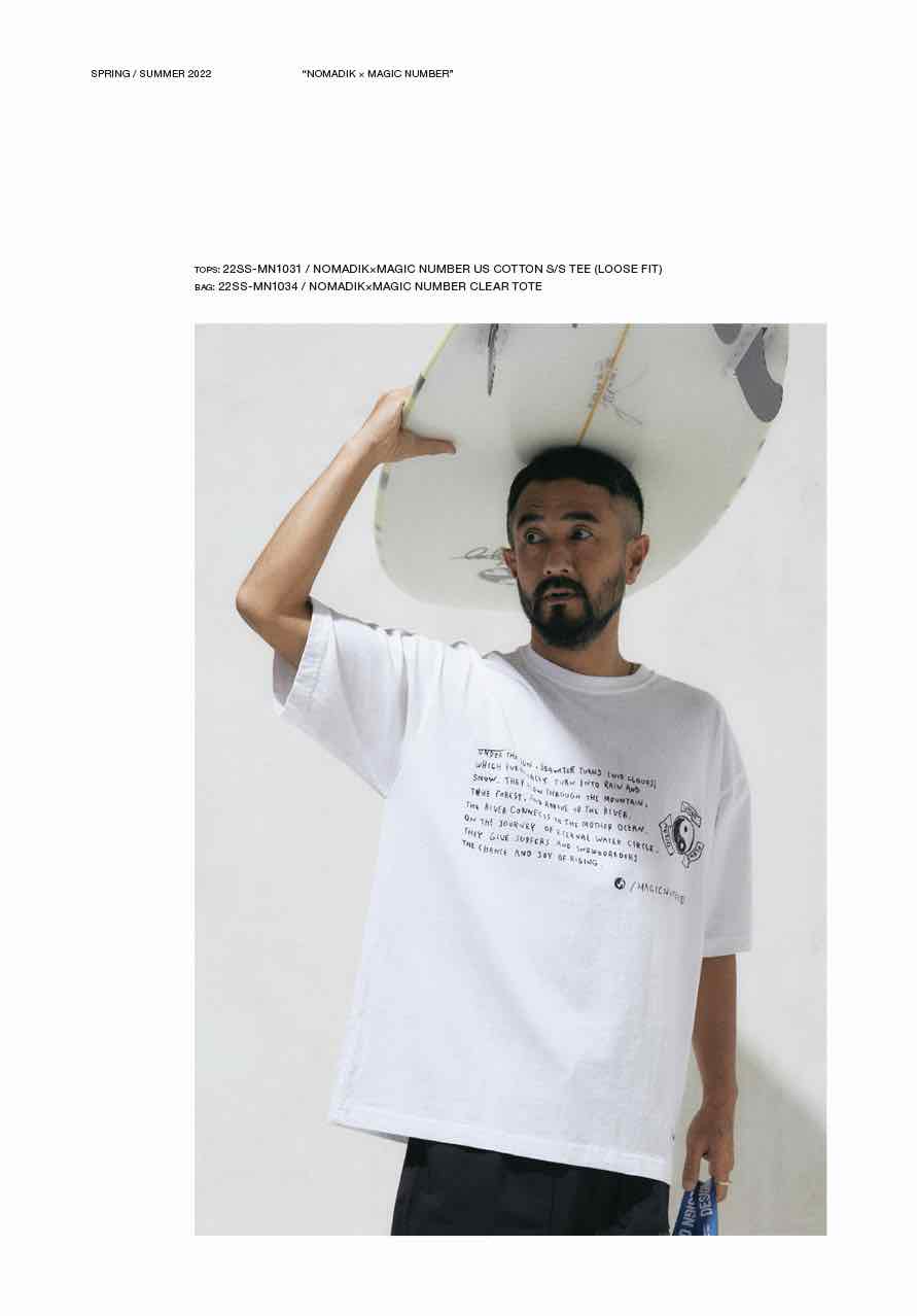 SS21コレクションで強烈なデビューを果たした”SEE YOU IN THE WATER”ロゴも様々なアイテムに落とし込みつつ、2020年にデビューを果たしたMAGIC NUMBERを代表するボードショーツ”THE SURFERS CODE”、志津野雷氏によるフォトTee、さらにFALL / WINTER 2021コレクションに引き続き、NOMADIKとのスペシャル・コラボレーションに至るまで、今回のSPRING / SUMMER 2022コレクションは、MAGIC NUMBERらしい世界観を感じられるラインナップとなっている。
