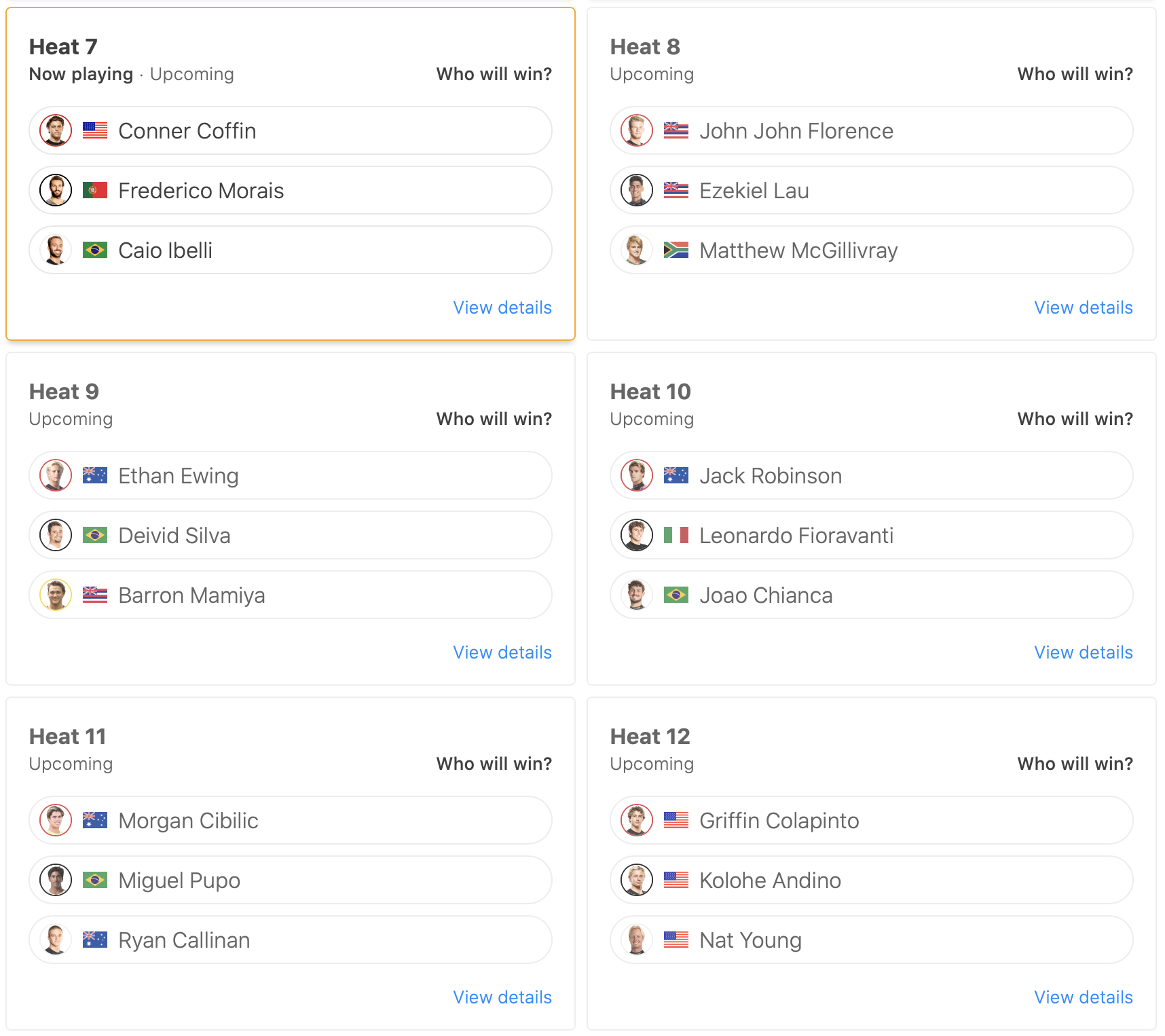 ヒート7にはConner Coffin、ヒート8にはJohn John Florence、ヒート9にはEthan Ewingと現在CTランキングトップのBarron Mamiya、ヒート10にはJack RobinsonとLeonardo Fioravanti、ヒート12にはGriffin ColapintoとKolohe Andino、Nat Youngとスター選手たちがラインナップしていることから、見応え十分であること間違いなし!!