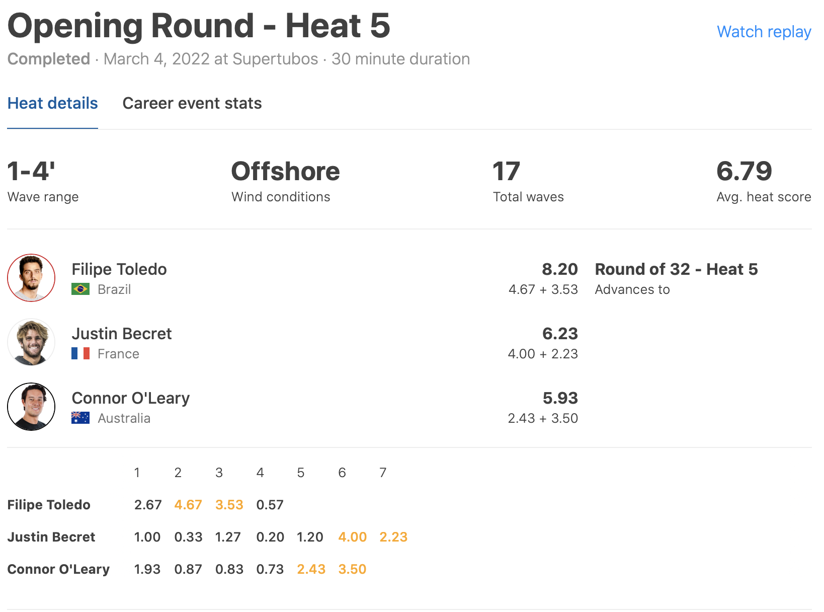 ロータイドと重なったため、出口のあるチューブが非常に少ないダンパーな良くないコンディションの中、ヒート5でいい波を掴むことができなかったConnor O’learyはスコアを伸ばすことができず、3位のポジションで敗者復活戦となるイリミネーション・ラウンドへ。