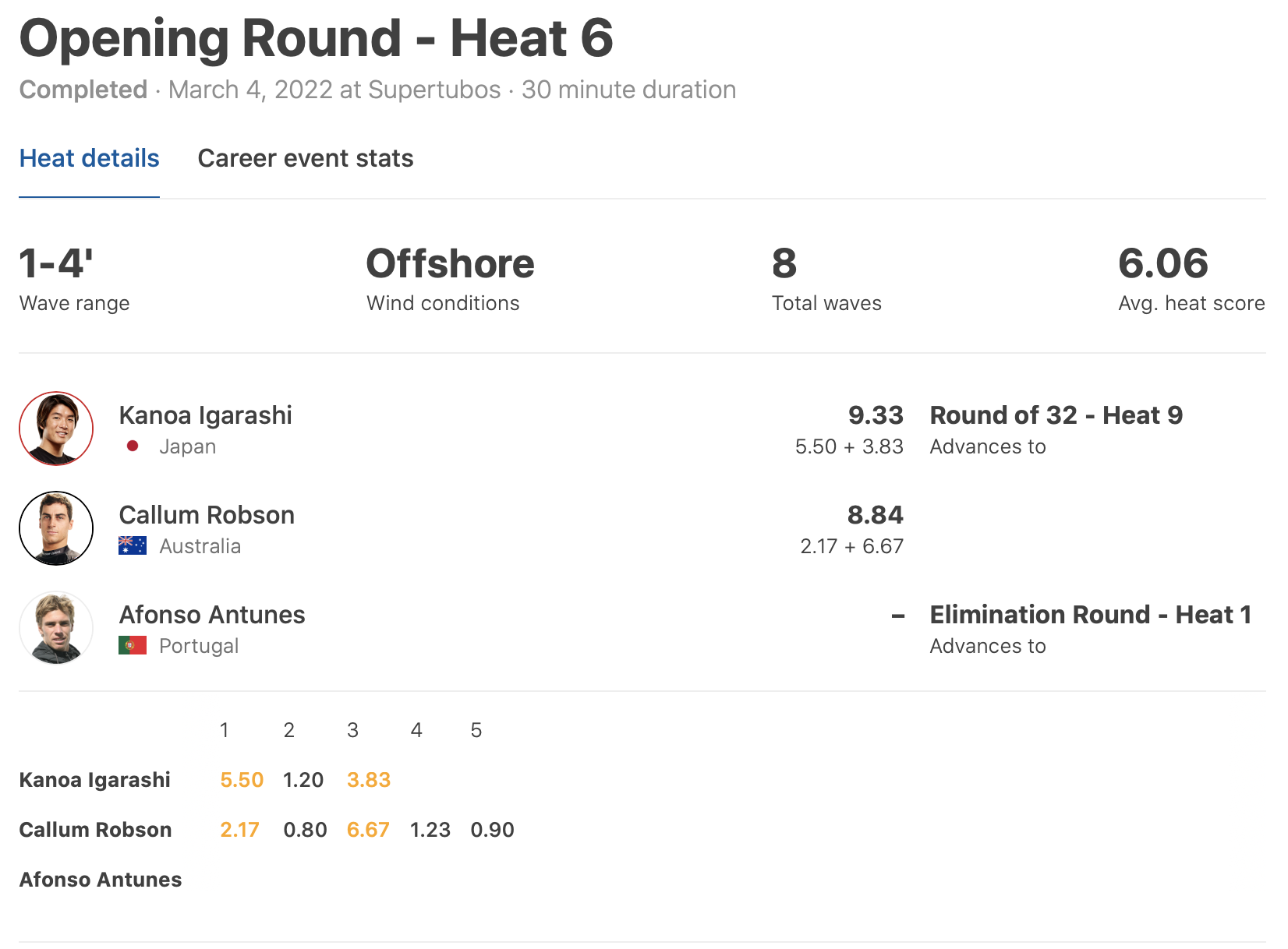 続くヒート6に登場となった五十嵐カノアは、あまりのいい波の少なさに開始10分で選手3名が誰も波を掴むことができず、リスタートなる場面も見られた中、バックサイド・チューブからのエアリバースで5.50pt、さらにヒート終盤に掴んだバックサイドのグラブレールでのチューブで3.83ptをバックアップにまとめ、1位のポジションでラウンドオブ32へ進出!
