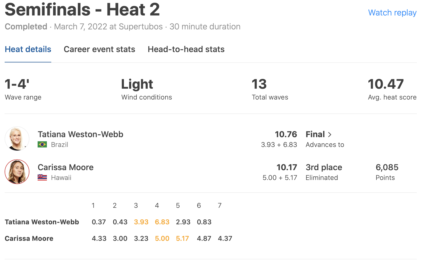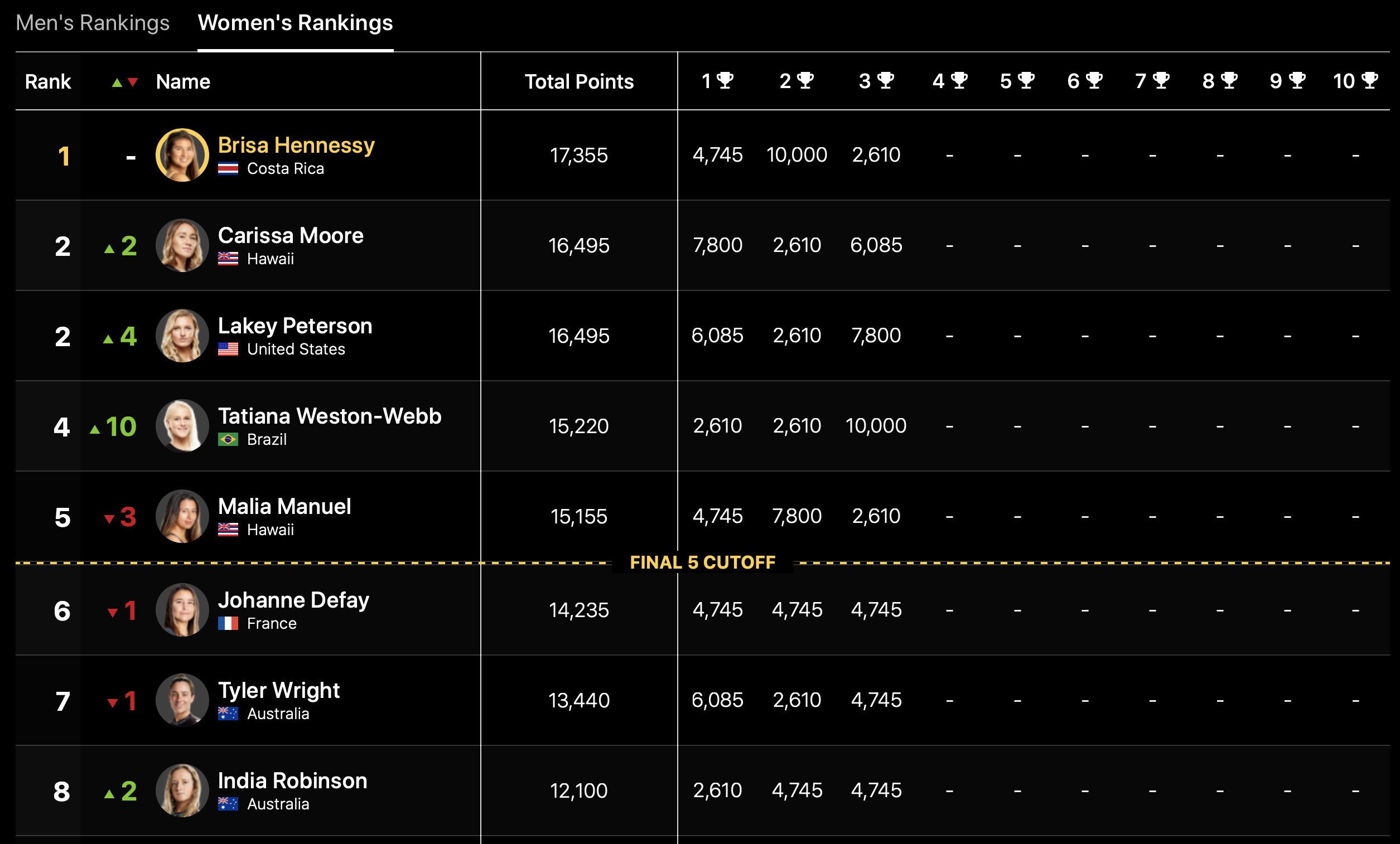 僅差で2位にCarissa Moore、3位にLakey Peterson、4位に今大会で優勝を果たしたTatiana Weston-Webb、5位にMalia Manuelとなっている。