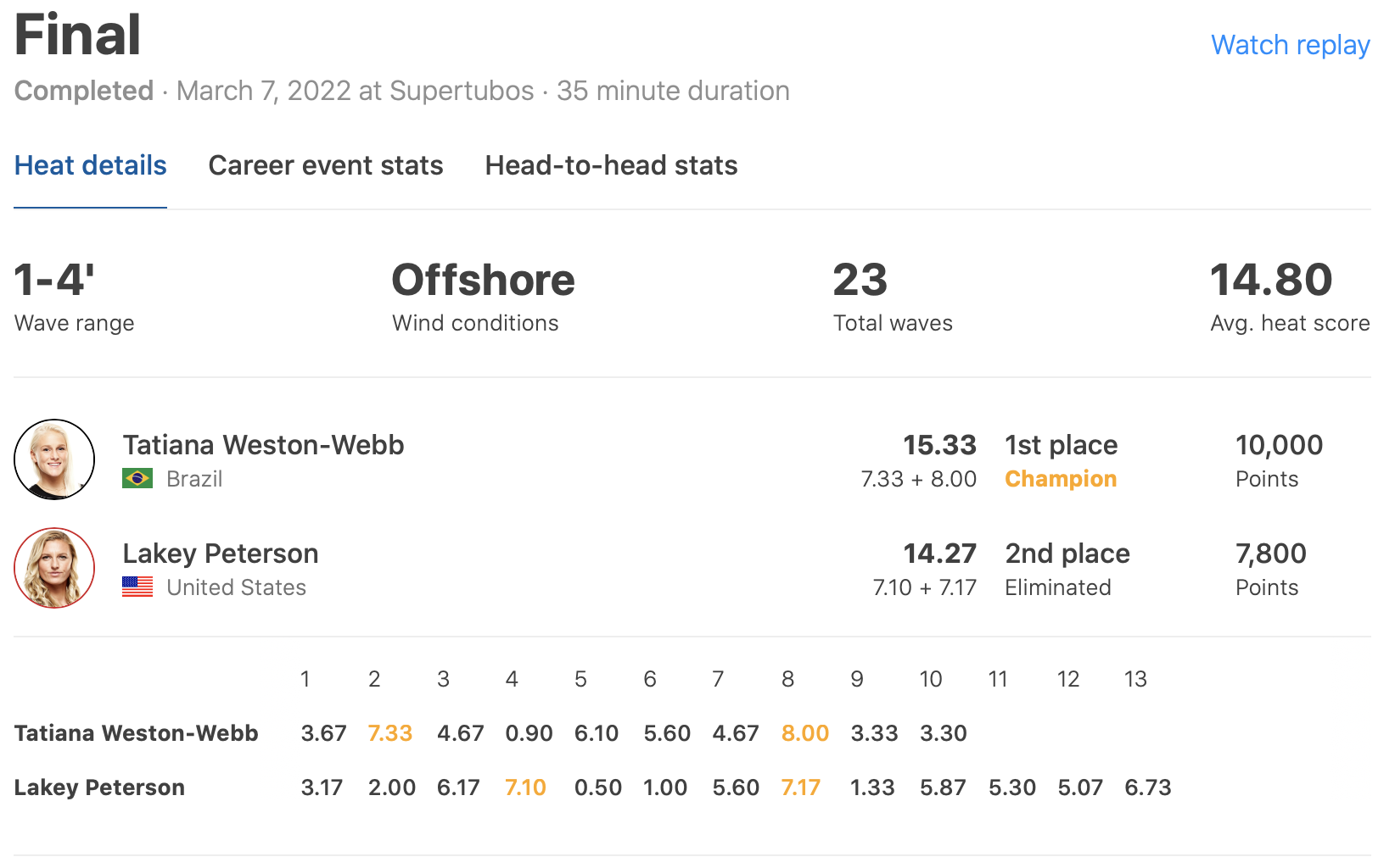 セミファイナルではワールドチャンプCarissa Mooreを、ファイナルではLakey Petersonを抑えての優勝となった。