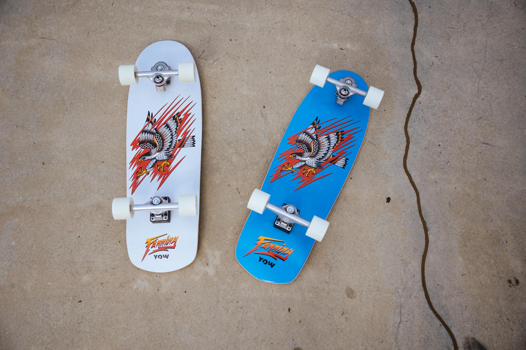 Mick Fanningモデルは32.5” × 10.25” × 18.5”WBのFanning Falcon Driverと、さらにプールやRセクションでの反復練習などさらなるパフォーマンスを追求した練習法も取り入れるサーファーに向けた若干長細いデッキデザインが特徴的な33.5” × 10.25” × 17”WBのFanning Falcon Performerの2モデルが登場する予定。