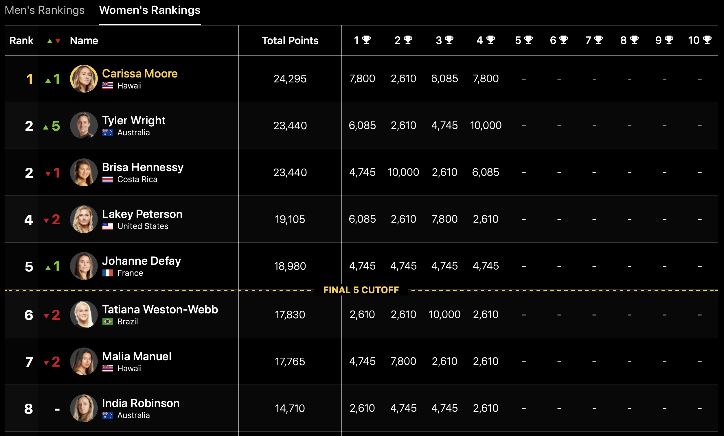 トップの座はCarissa Mooreがキープしているが、Tyler WrightとBrissa Hennessyとの差は僅か855ptと、いつ順位の変動があってもおかしくない状況となっている。