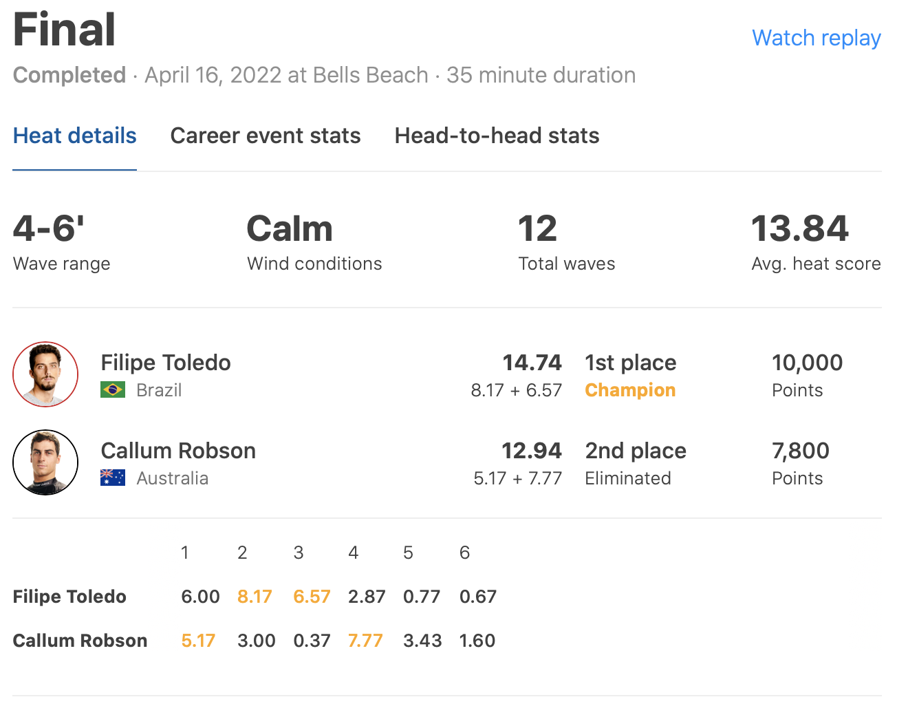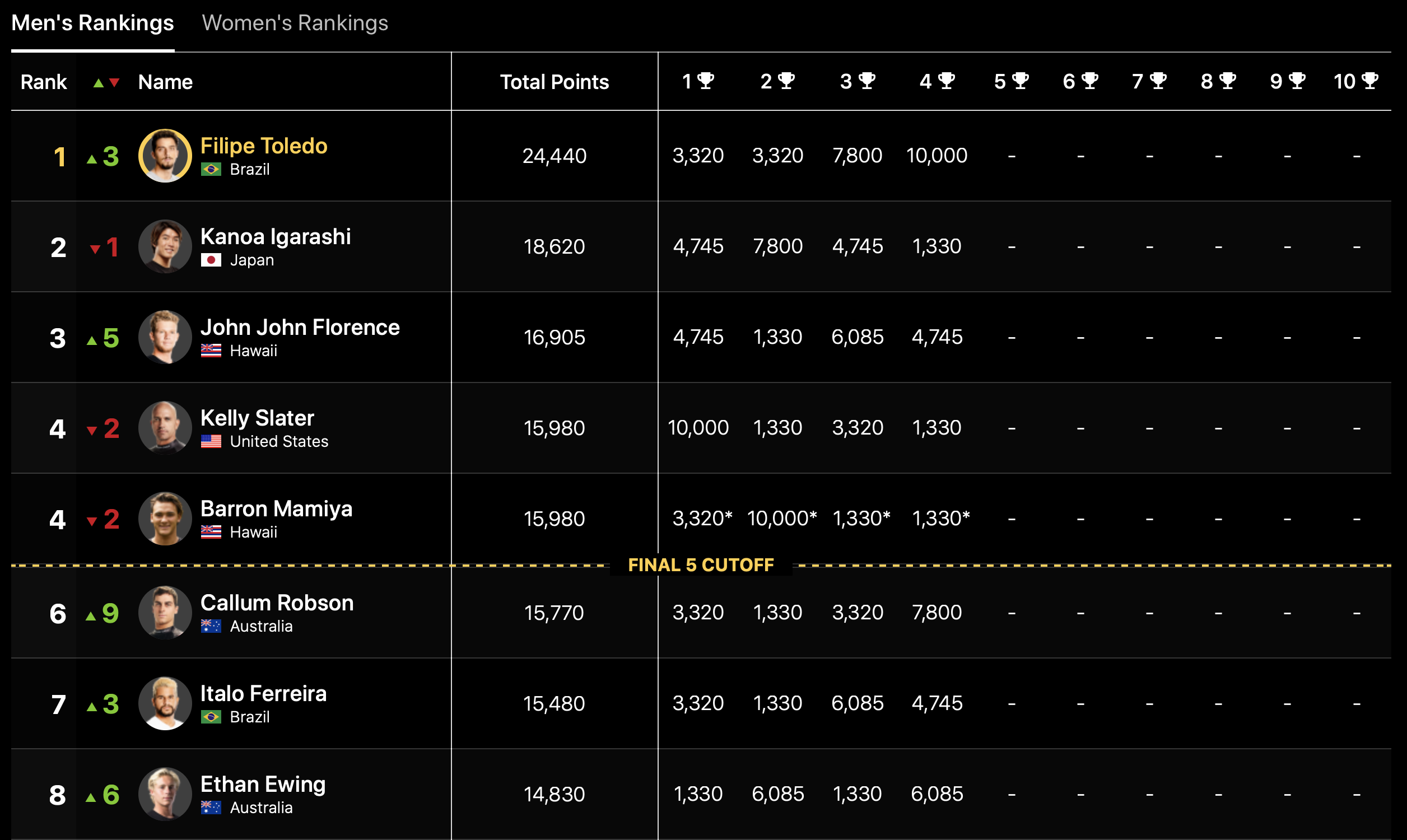 Filipe Toledoは今回の優勝によりCTランキングトップへジャンプアップ!