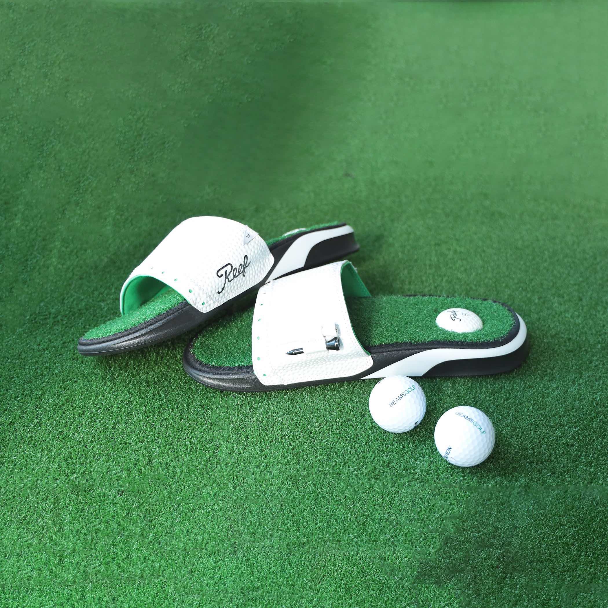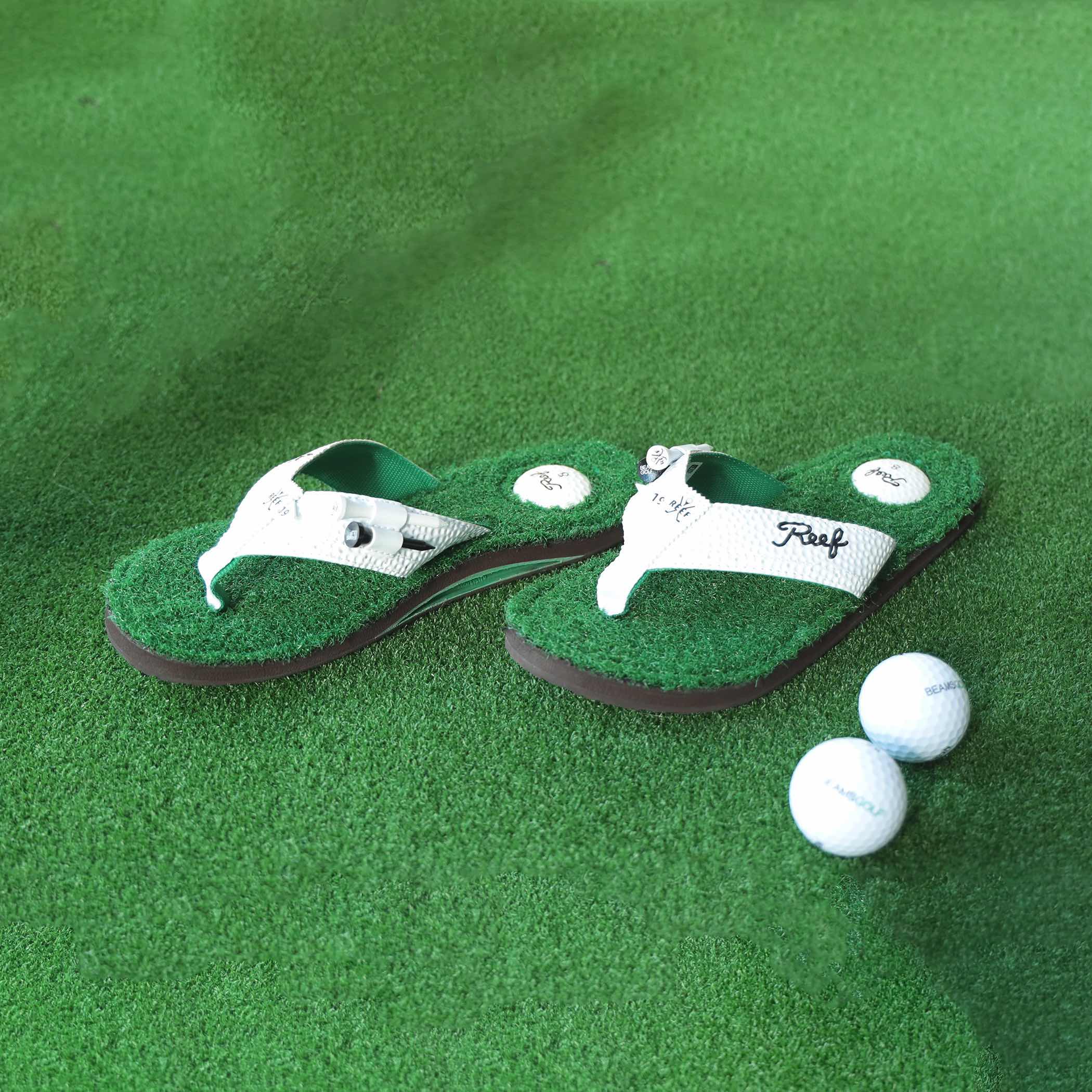 その全貌は、まるでゴルフ場の芝の上を歩いているかのようなリラックスした感覚を味わえるサンダルとなっており、EVA素材のフットベッド、ラバーストラップ、人工芝を全面に表現。