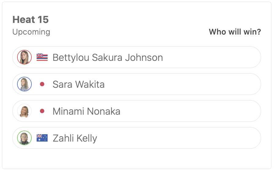 また、この日行われなかった脇田紗良と野中美波は同じラウンドオブ64のヒート15に組み込まれ、Bettylou Sakura Johnson、Zalhi Kellyと対戦予定。