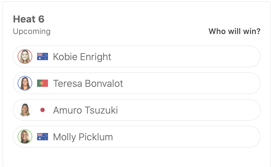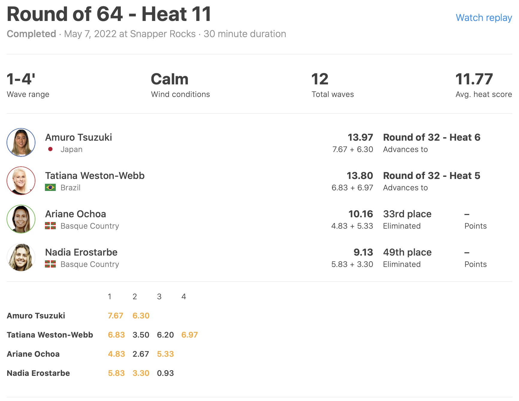 注目の日本人選手の活躍は、ヒート5の松永莉奈、ヒート10の前田マヒナの2名が惜しくもこのラウンドで敗退となってしまったその一方で、ヒート11に出場した都筑有夢路がTatiana Weston Webbを2位に抑えて1位でラウンドオブ32進出!