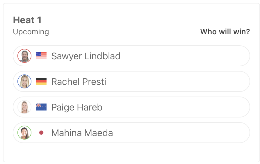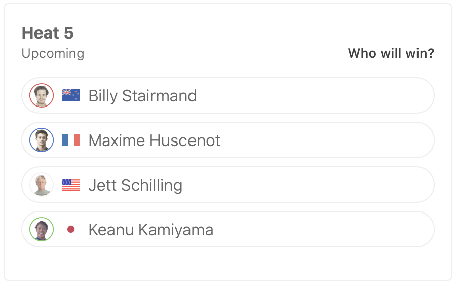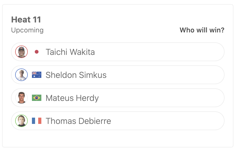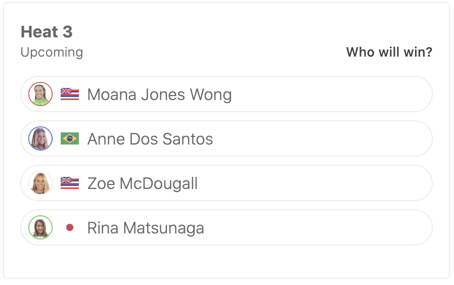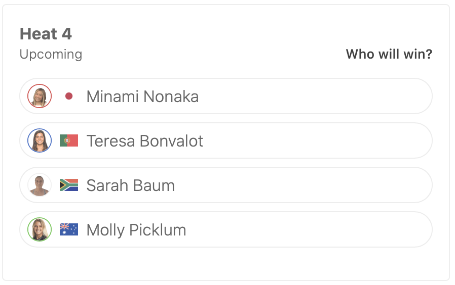 WOMENSラウンドオブ32ではヒート1に前田マヒナ、ヒート3に松永莉奈、ヒート7に脇田紗良が出場予定となっている。