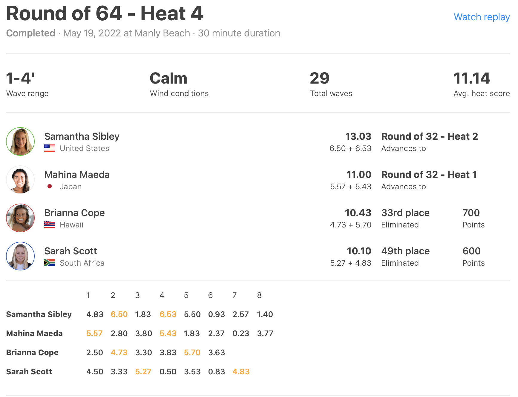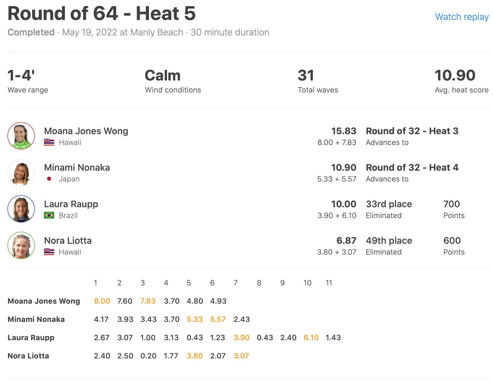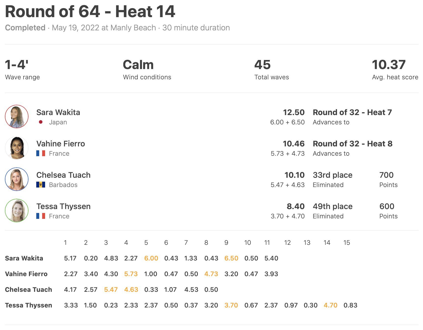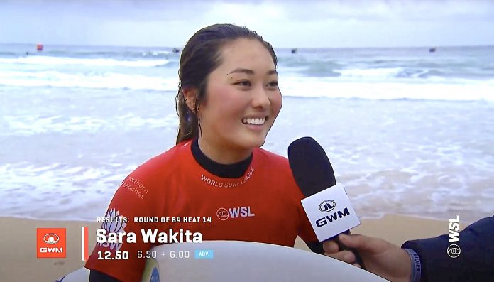 さらにこの日の最終ヒートとなったヒート14では脇田紗良が6.00ptと6.50ptをマークしてVahine Fierroを2位に、Chelsea Tuachを3位に抑えて見事1位でラウンドオブ32進出を果たした!