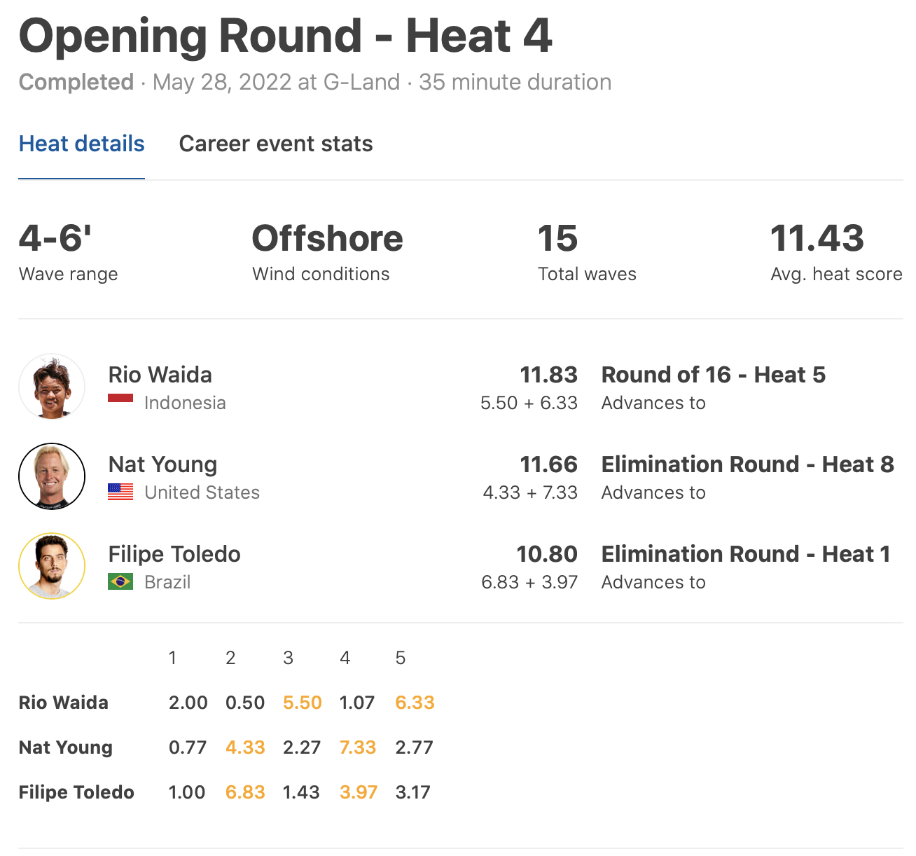 HEAT 4: Rio Waida (IDN) 11.83 DEF. Nat Young (USA) 11.66, Filipe Toledo (BRA) 10.80