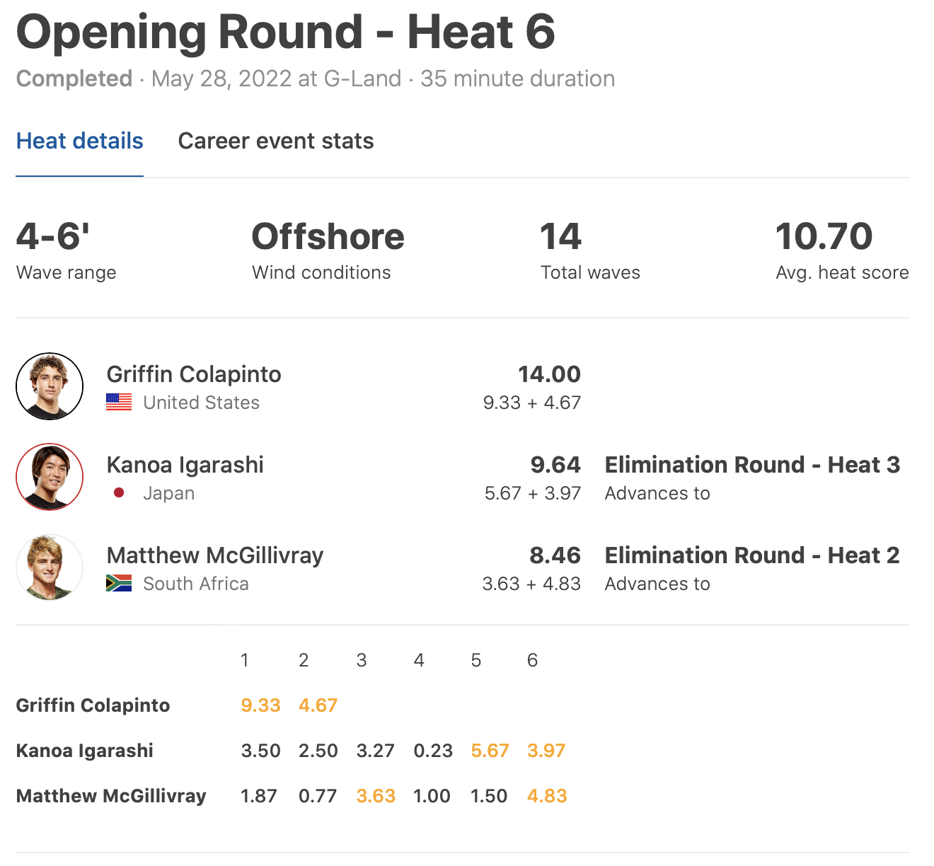 HEAT 6: Griffin Colapinto (USA) 14.00 DEF. Kanoa Igarashi (JPN) 9.64, Matthew McGillivray (ZAF) 8.46