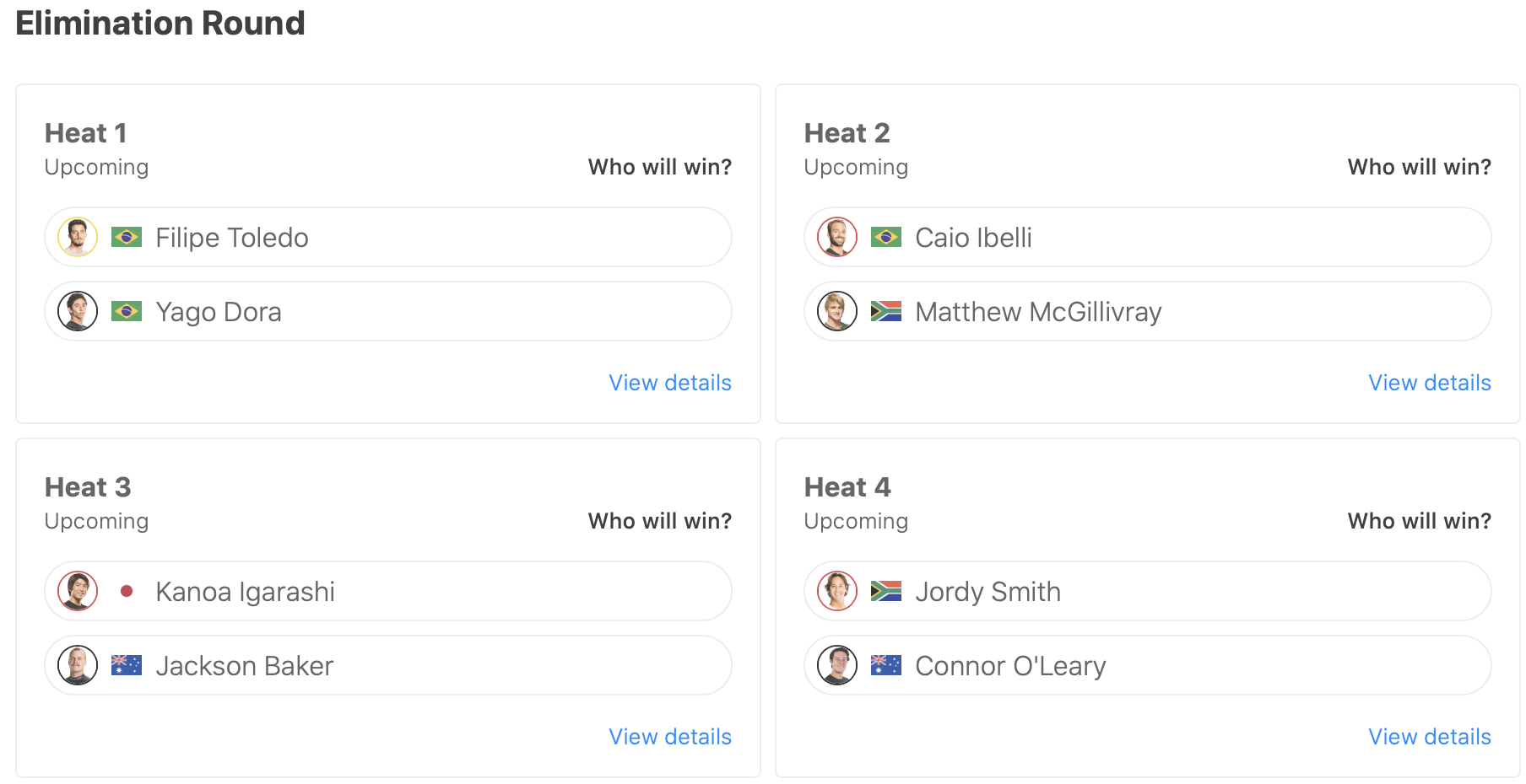迎えるイリミネーション・ラウンドでは五十嵐カノアがヒート3でJackson Bakerと、ヒート4ではConnor O’learyがJordy Smithと対戦。