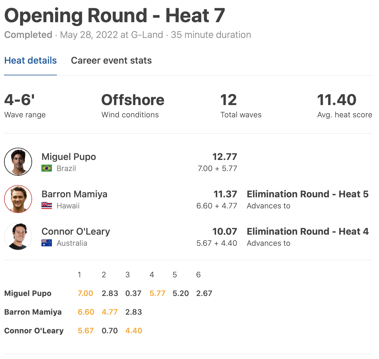 HEAT 7: Miguel Pupo (BRA) 12.77 DEF. Barron Mamiya (HAW) 11.37, Connor O’Leary (AUS) 10.07