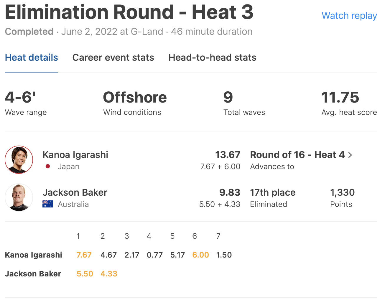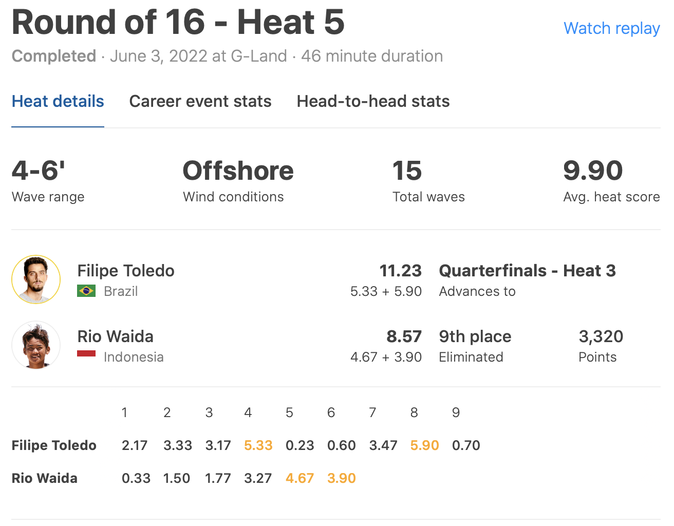 オープニングラウンドでも対戦したFilipe Toledoにリベンジを果たされる形となり、9位でフィニッシュとなった。