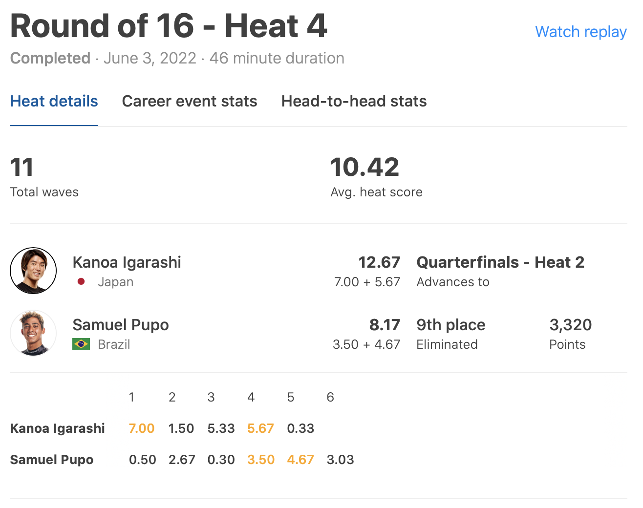 迎えるクォーターファイナルではヒート2で五十嵐カノアがJack Robinsonと、ヒート4でConnor O’learyがMatthew McGillibrayと対戦予定。