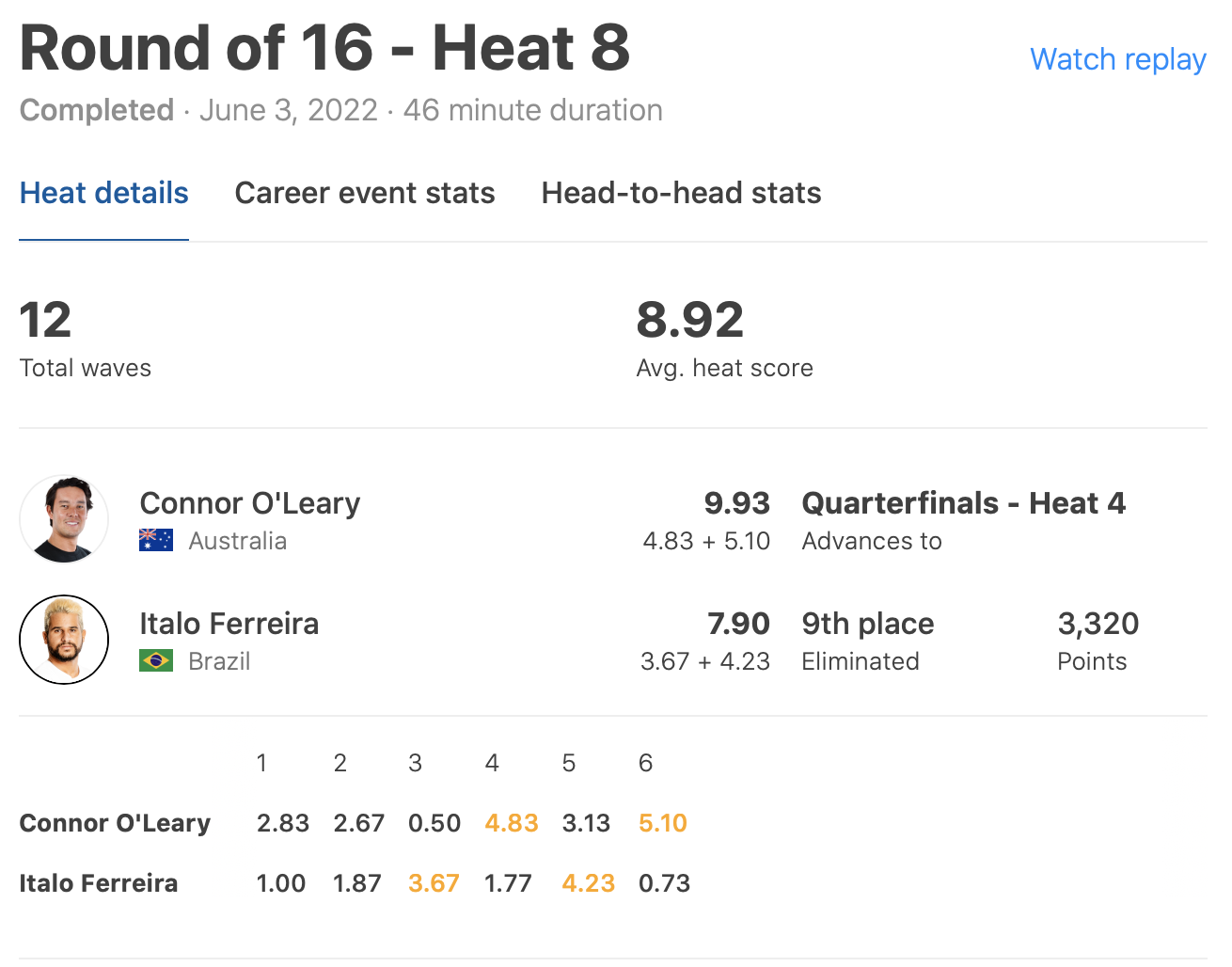 さらにラウンドオブ16のヒート8ではワールドチャンプItalo Ferreiraと対戦。