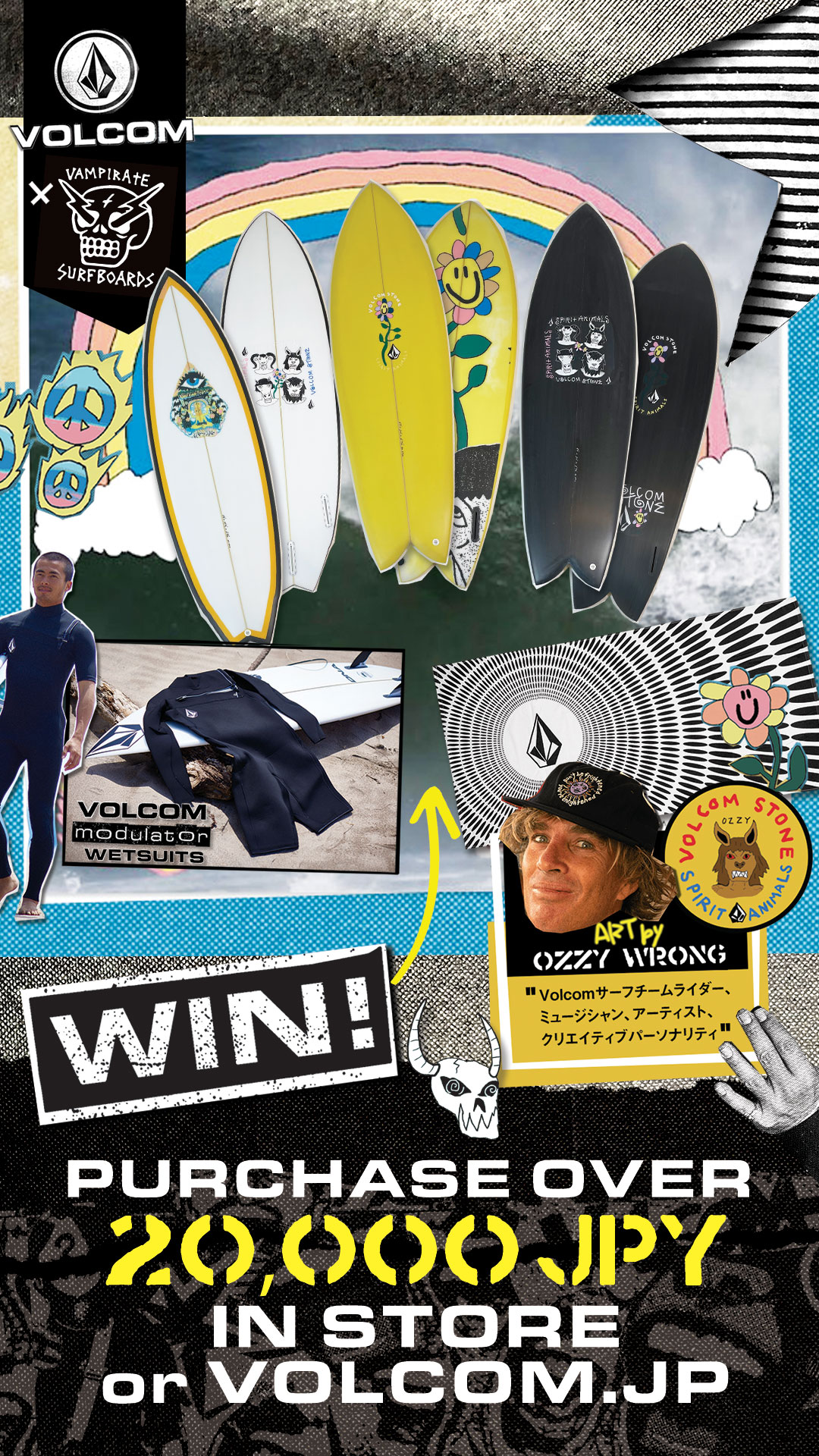 VOLCOMオンラインストアと各店舗にてVOLCOMアイテムを20,000円以上お買い上げの方を対象に、Ozzy WrongによるVOLCOM×VAMPIRATE限定サーフボードとVOLCOMモジュレーター・ウエットスーツ、さらにサーフタオルとTシャツのセット3が各3名に当たるキャンペーンを実施中!!