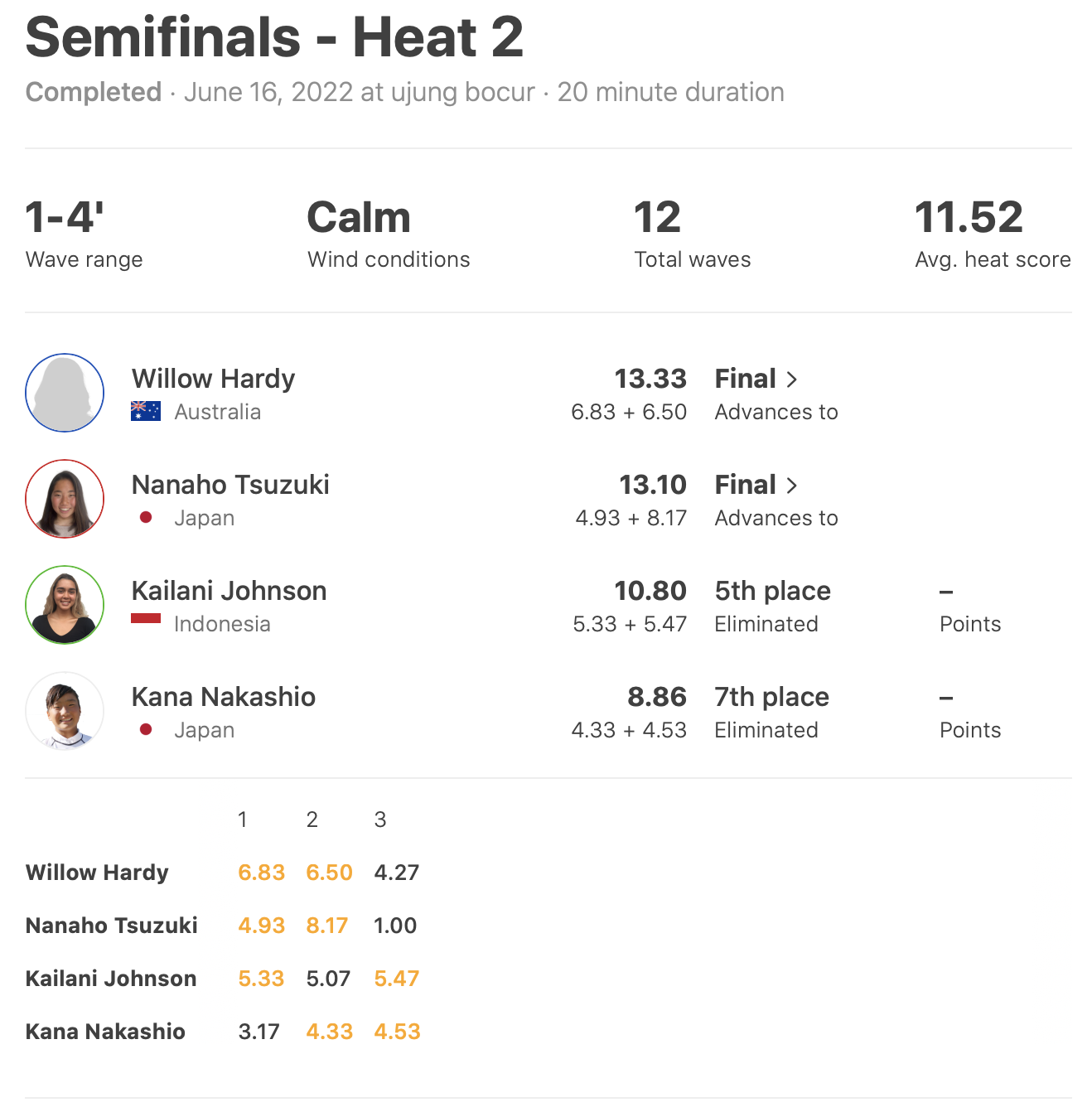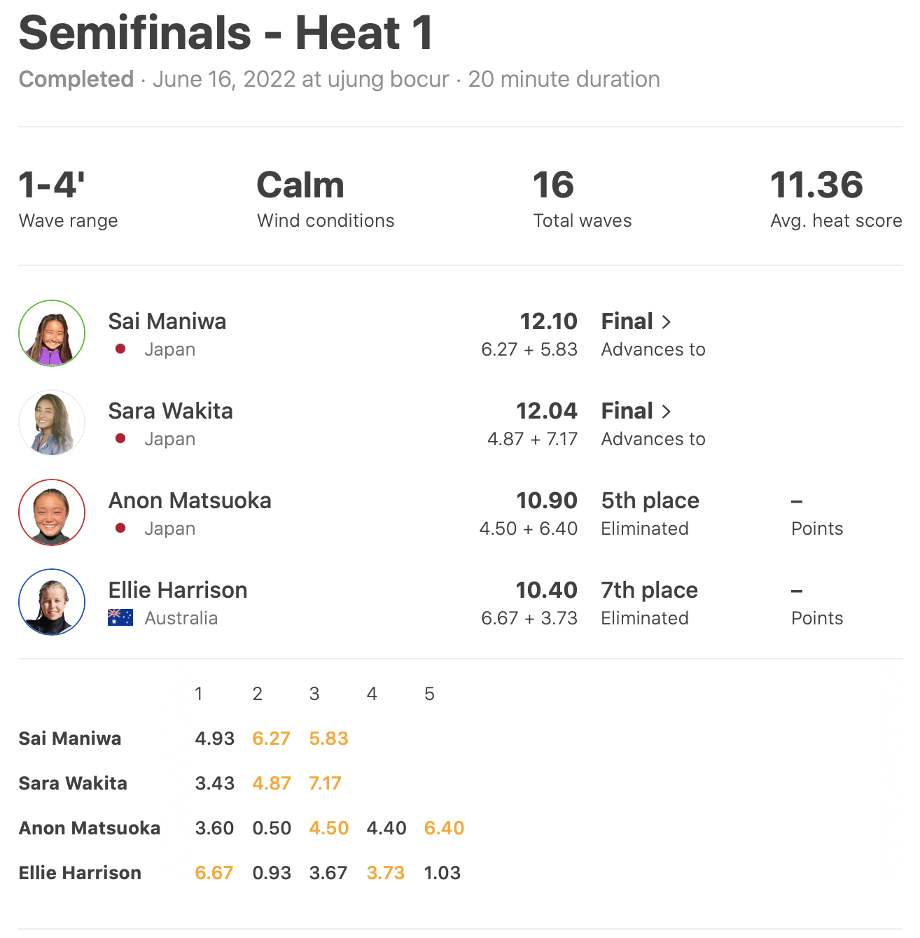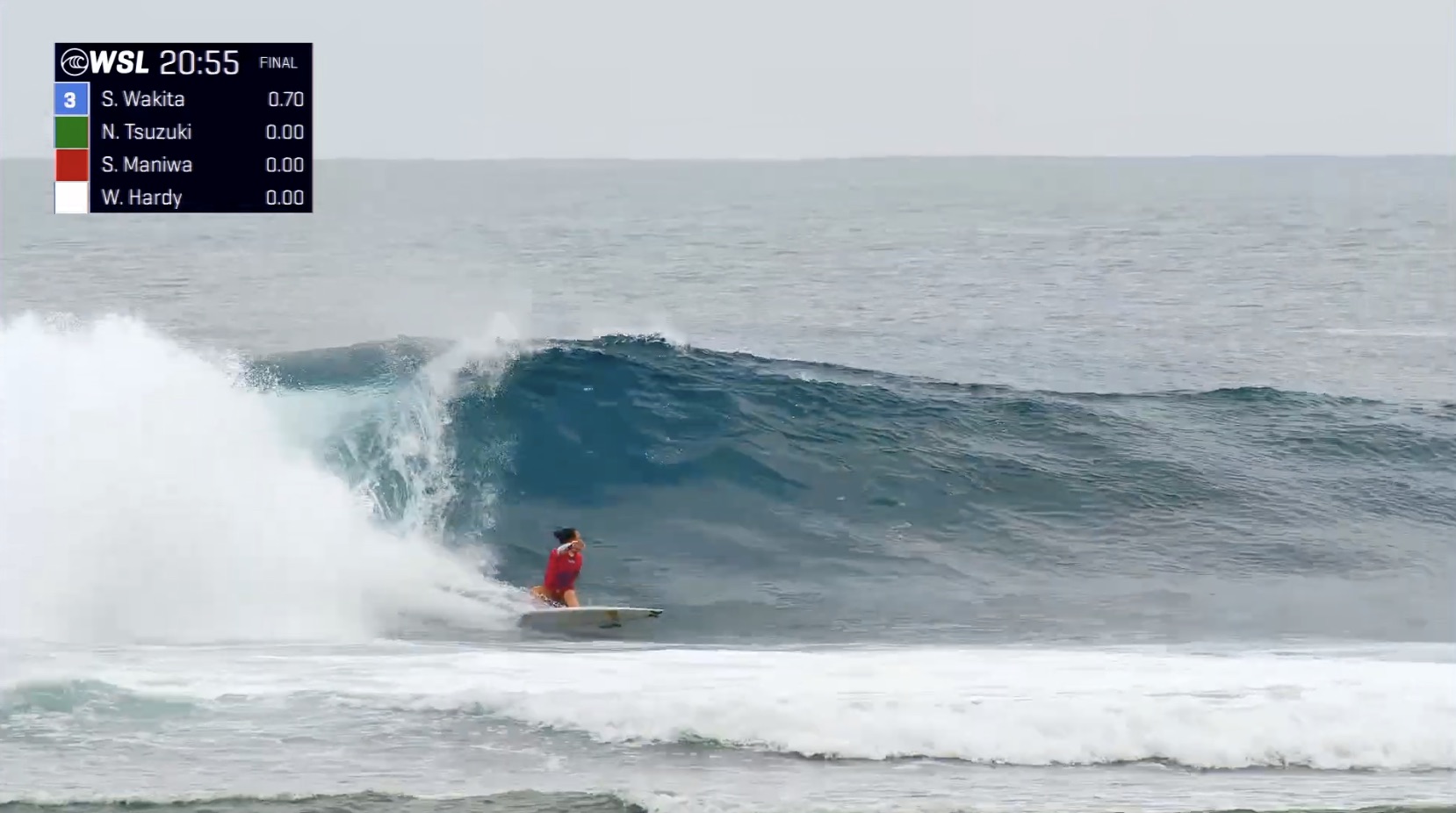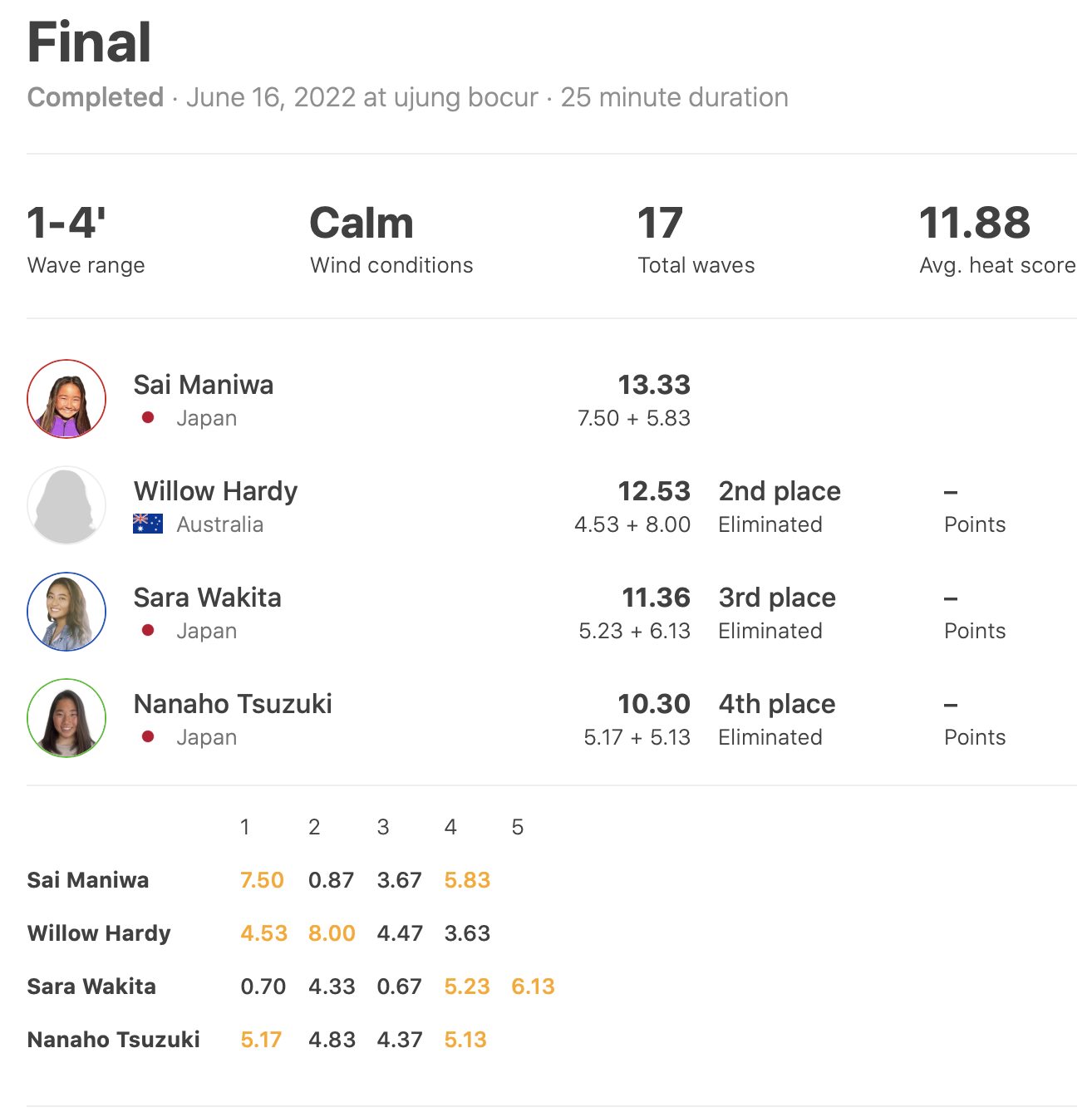 オーバーヘッドのクリーンなパーフェクトなロングレフトとなった中、ファイナルは馬庭彩、脇田紗良、都築虹帆といった3名の日本人選手にオーストラリア出身のWillow Hardyの4名で行なわれ、ヒート前半に馬庭彩が掴んだ1本目の波での7.50ptが優勝の決め手となった。