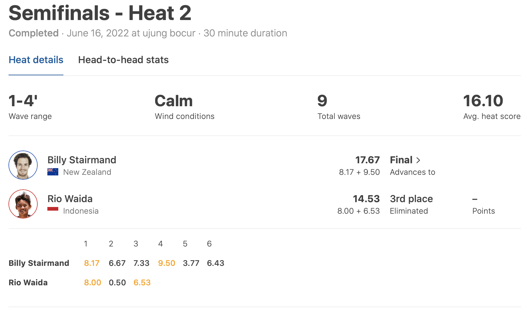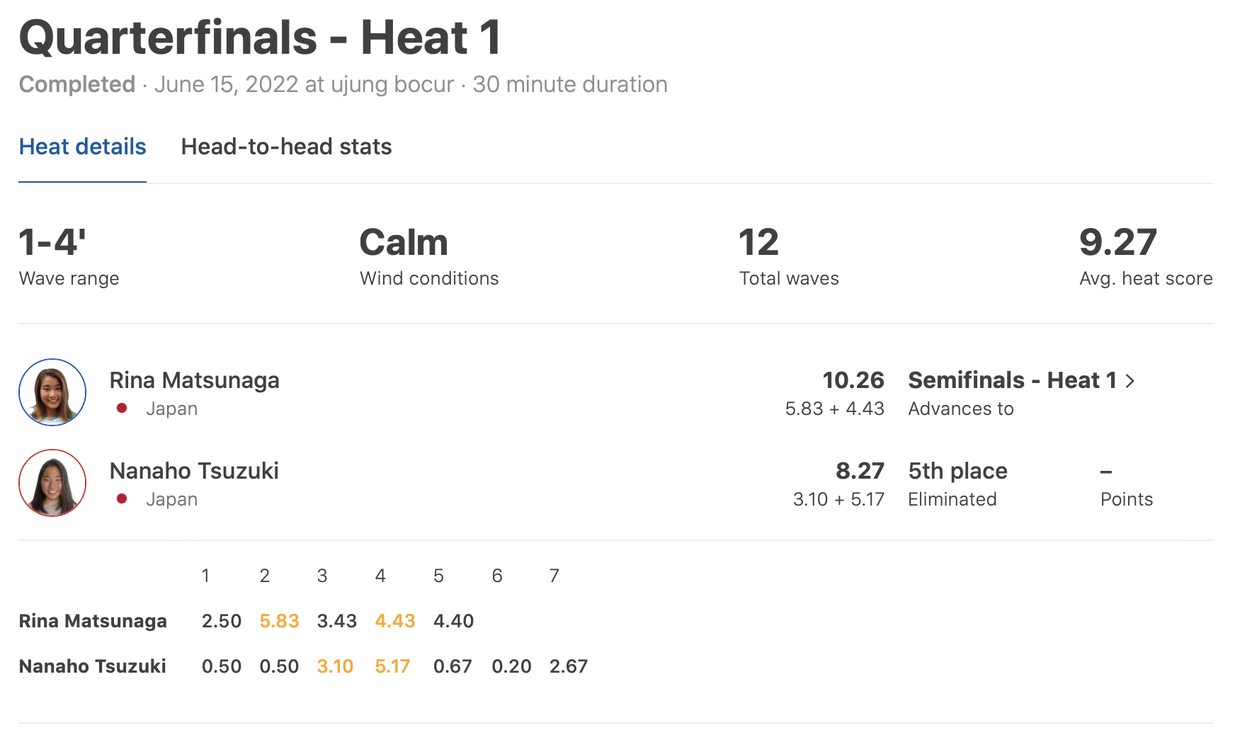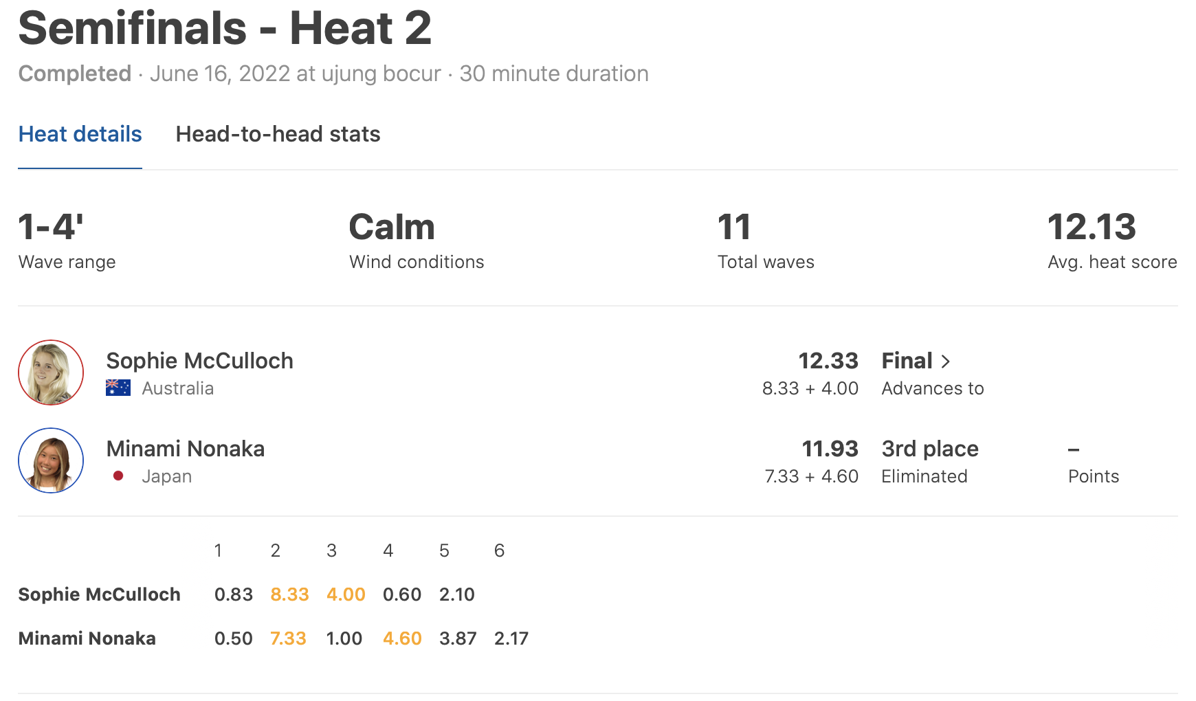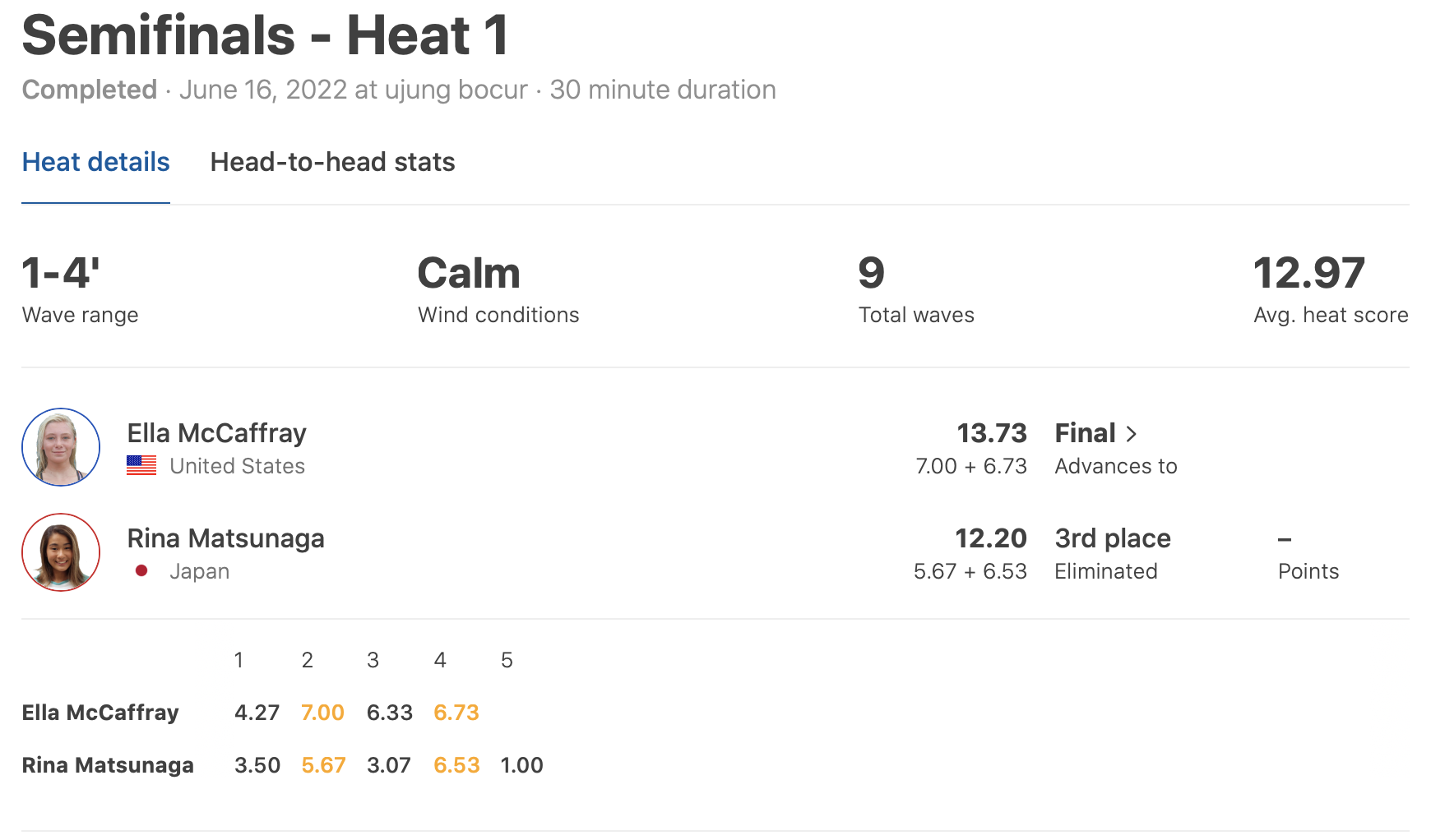 オーバーヘッドのクリーンなパーフェクトなロングレフトとなった中、ファイナルは馬庭彩、脇田紗良、都築虹帆といった3名の日本人選手にオーストラリア出身のWillow Hardyの4名で行なわれ、ヒート前半に馬庭彩が掴んだ1本目の波での7.50ptが優勝の決め手となった。
