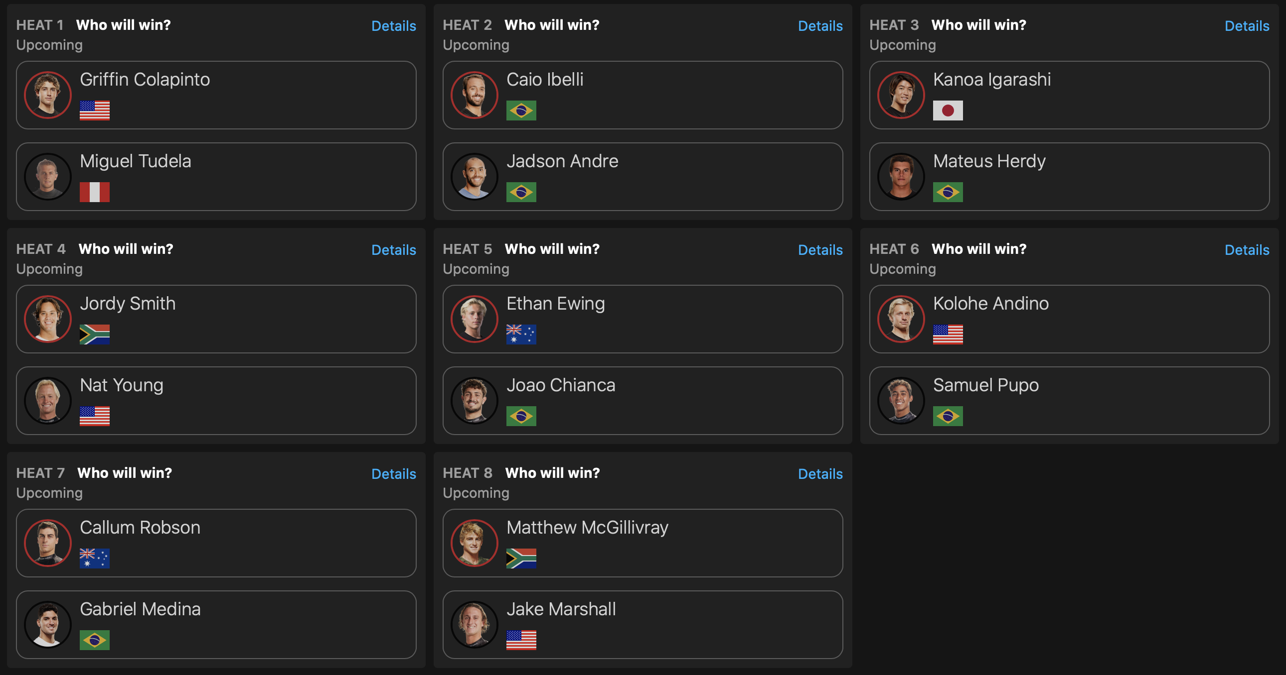 HEAT 2: Michael Rodrigues (BRA) 12.33 DEF. Griffin Colapinto (USA) 12.27, Jake Marshall (USA) 7.24