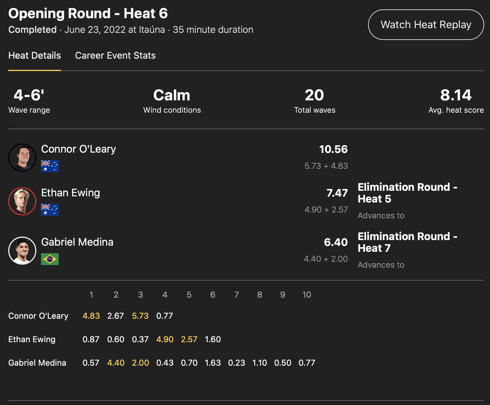 HEAT 6: Connor O’Leary (AUS) 10.56 DEF. Ethan Ewing (AUS) 7.47, Gabriel Medina (BRA) 6.40