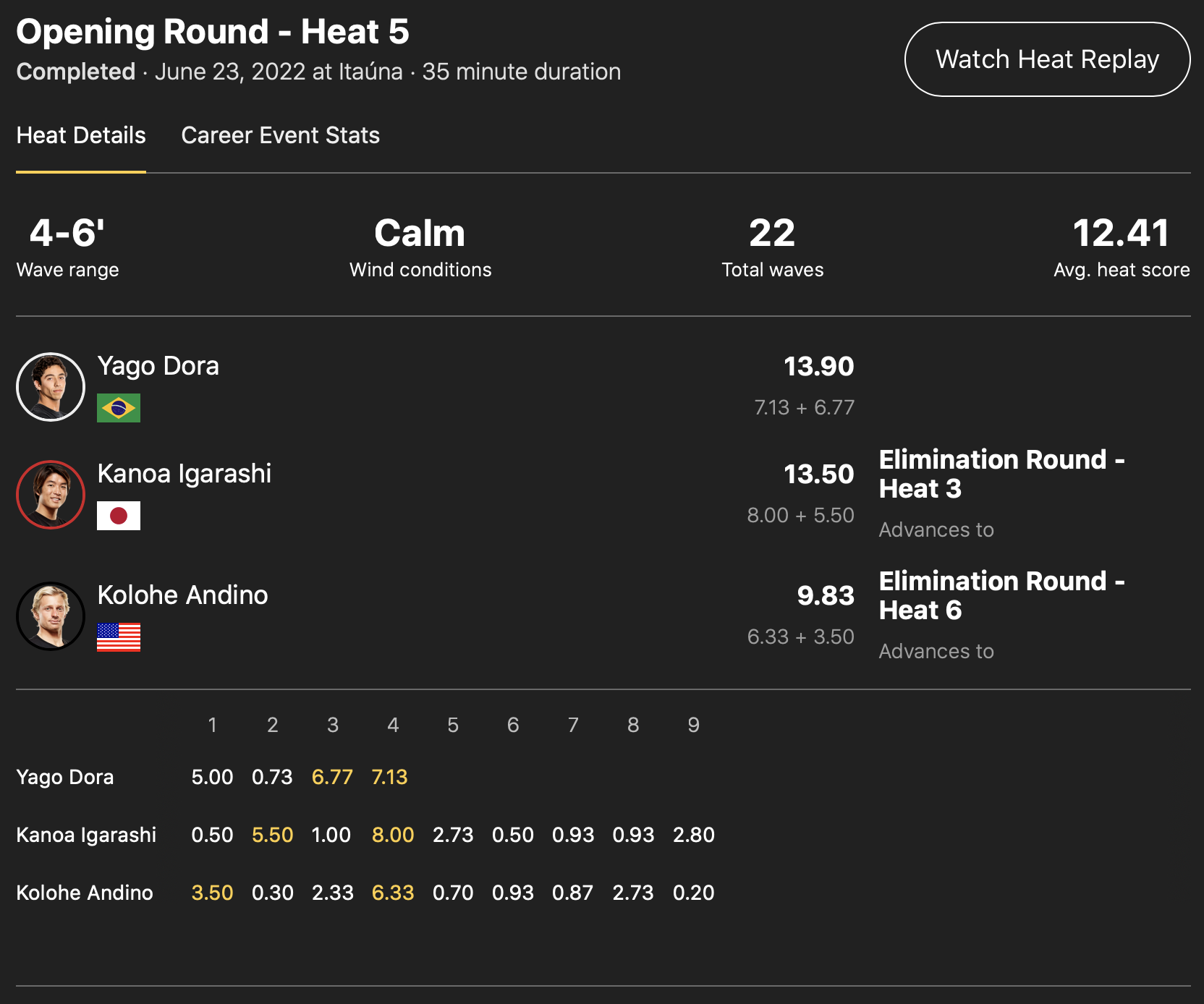 HEAT 5: Yago Dora (BRA) 13.90 DEF. Kanoa Igarashi (JPN) 13.50, Kolohe Andino (USA) 9.83