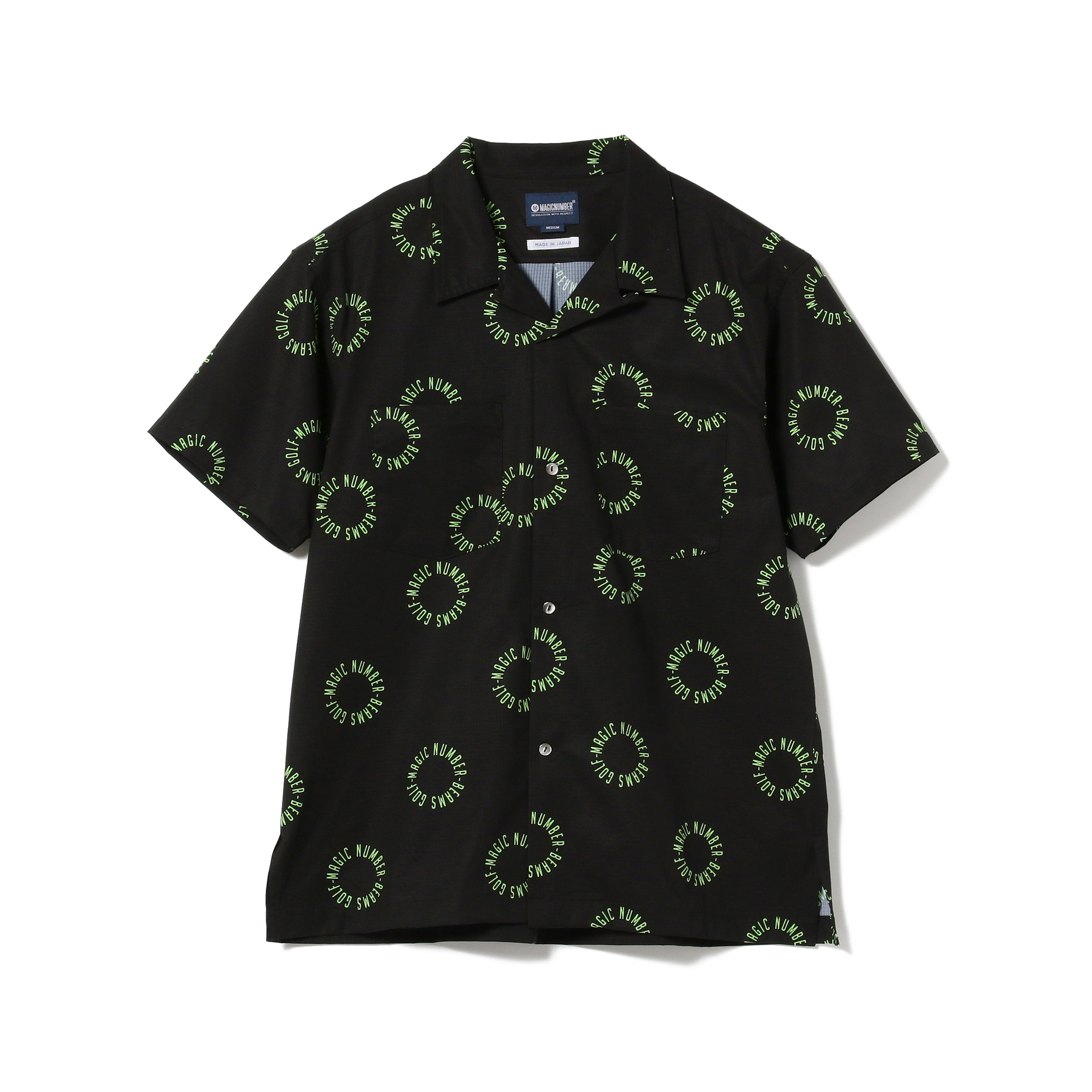 中村がドキュメンタリー映画からデザインの影響を受け、インスピレーションが生まれたサークルロゴ柄をネオンライムカラーでポップに表現。ボックスシルエット型オープンカラーシャツ。素材は2WAYストレッチで着心地が良く、高通期、軽量、撥水が特徴。