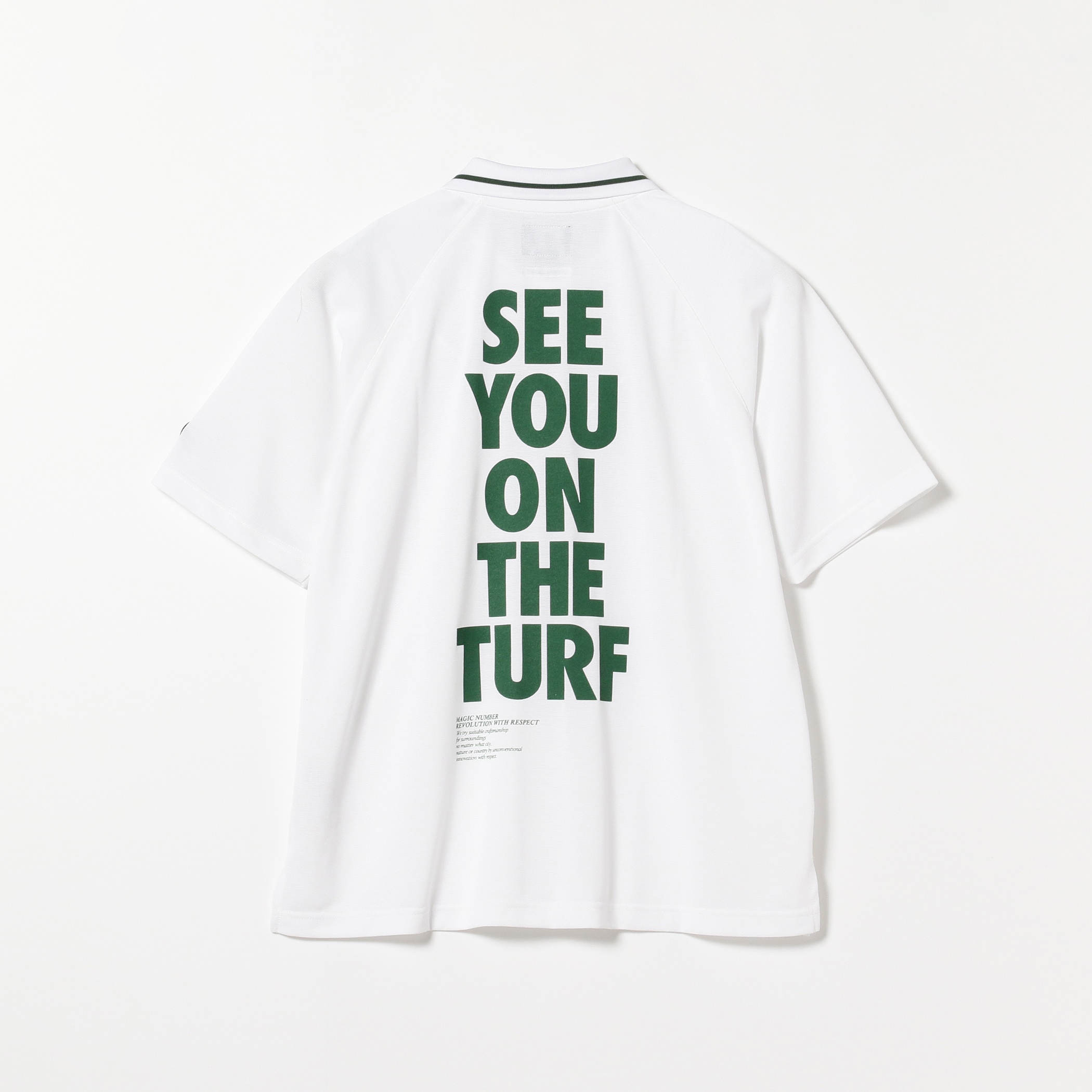 バックプリントには圧倒的な存在感が特徴のSEE YOU ON THE TURFを。素材は湿気や汗を素早く吸収し、乾燥性が高い吸水速乾仕様。抗ピリング性、イージーケアも対応。