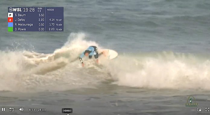 Sarah Baumが3本目で4.50pt、4本目で5.17ptとヒート前半からリズミカルにスコアを重ねてリードを測る一方で、他の選手たちがオンショア気味でショルダーの続く波が少ないコンディションに苦戦を強いられる中、松永莉奈が2本目に3.50pt、8本目に2.93ptをまとめて2位のポジションをキープ。