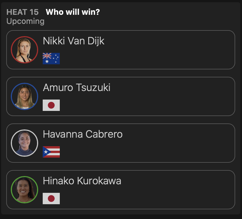ヒート15では都筑有夢路が黒川日菜子と同じヒートに組み込まれ、CTサーファーのNikki Van DijkとHavanna Cabreroと対戦。