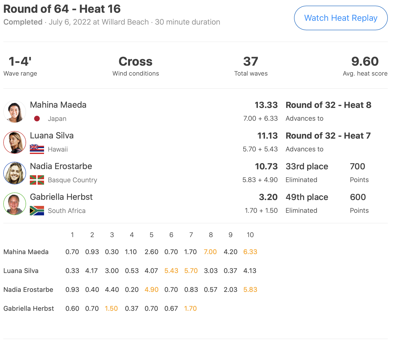 続くヒート16で7.00ptと6.33ptといったグッドスコア2本をマークした前田マヒナが1位のポジションでラウンドオブ32へ進出を果たした!