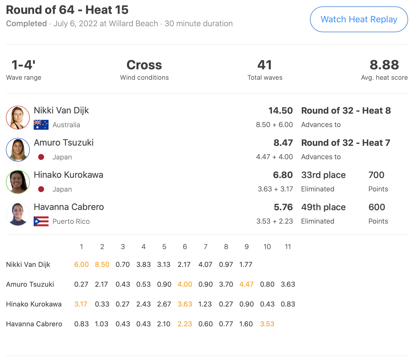 注目の日本人選手の活躍は、WOMENSのヒート15で黒川日菜子と同じヒートに組み込まれていた都筑有夢路がNikki Van Dijkに次ぐ2位のポジションでラウンドアップ!