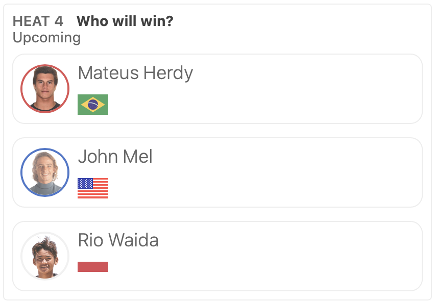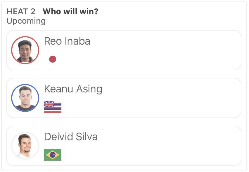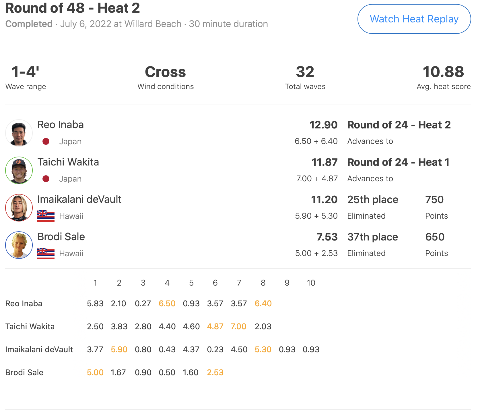 MENSラウンドオブ48のヒート2で同じヒートで対戦となった稲葉玲王と脇田泰地がCTサーファーImaikalani deVaultとBrondi Saleを抑えて、稲葉が1位、脇田が2位のポジションでラウンドアップ!