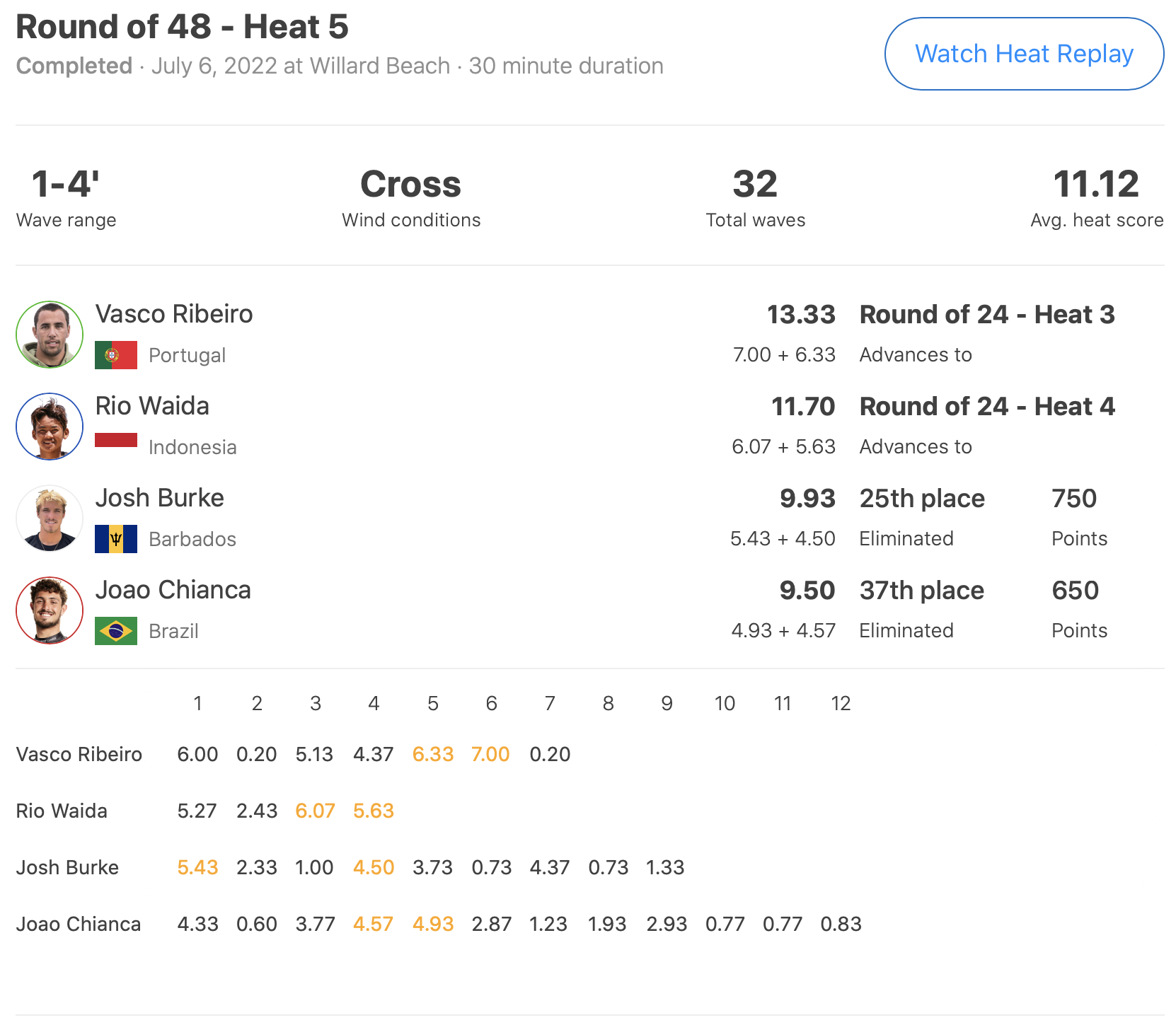 ヒート5の和井田理央はポルトガルのVasco RIbeiroに次ぐ2位のポジションでラウンドオブ24へと駒を進めた。