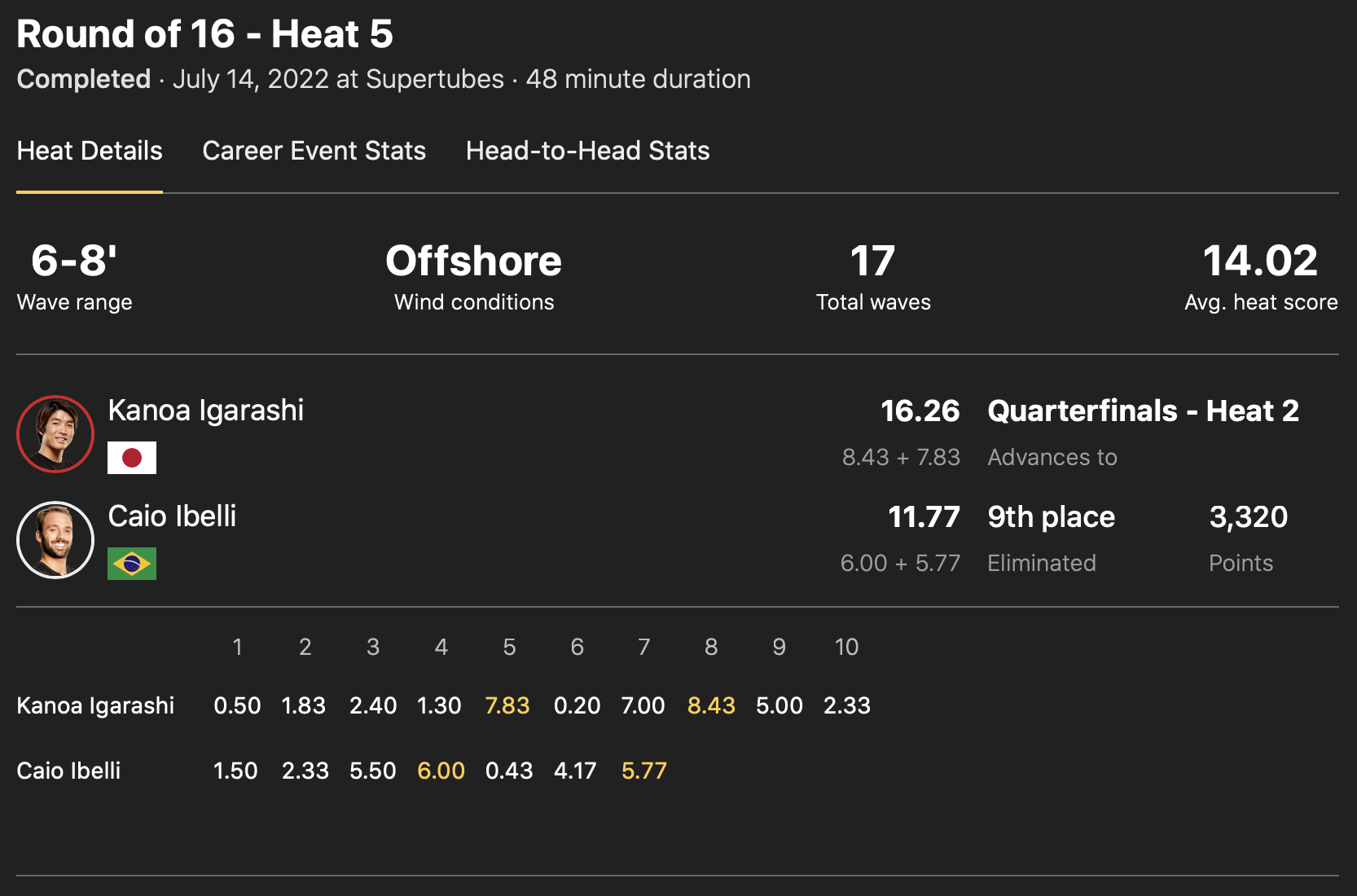 迎えるクォーターファイナルでは五十嵐カノアはヒート2でItalo Ferreiraと対戦。