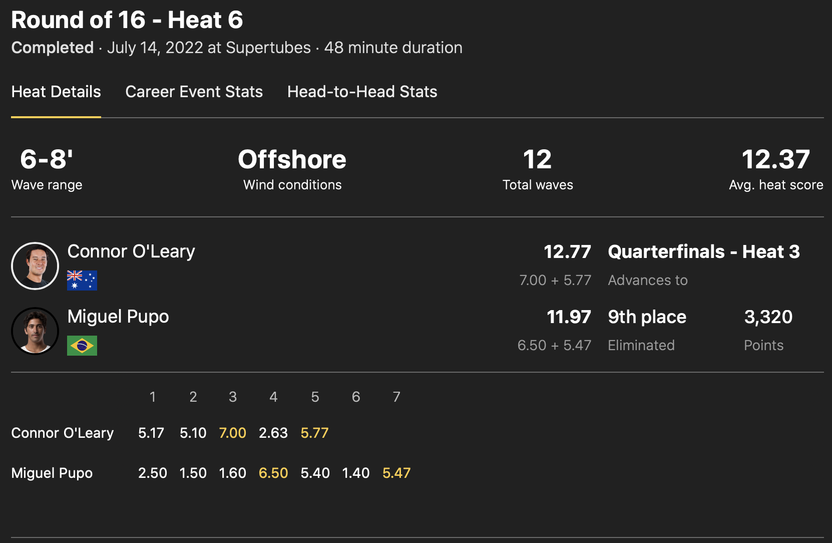 さらに続くヒート6でMiguel Pupoと戦ったConnor O’learyは、ビッグセットにワイルドかつソリッドなターンを入れて7.00ptと5.77ptをまとめ、見事クォーターファイナルへと駒を進めた!