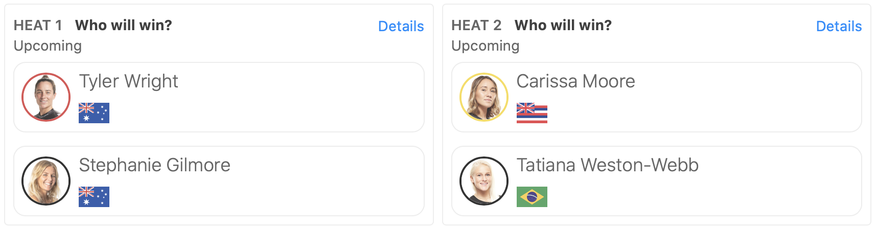 また、WOMENSのセミファイナルはヒート1でTyler WrightとStephanie Gilmoreが、ヒート2ではCarissa MooreとTatiana Weston-Webbが対戦予定となっている。