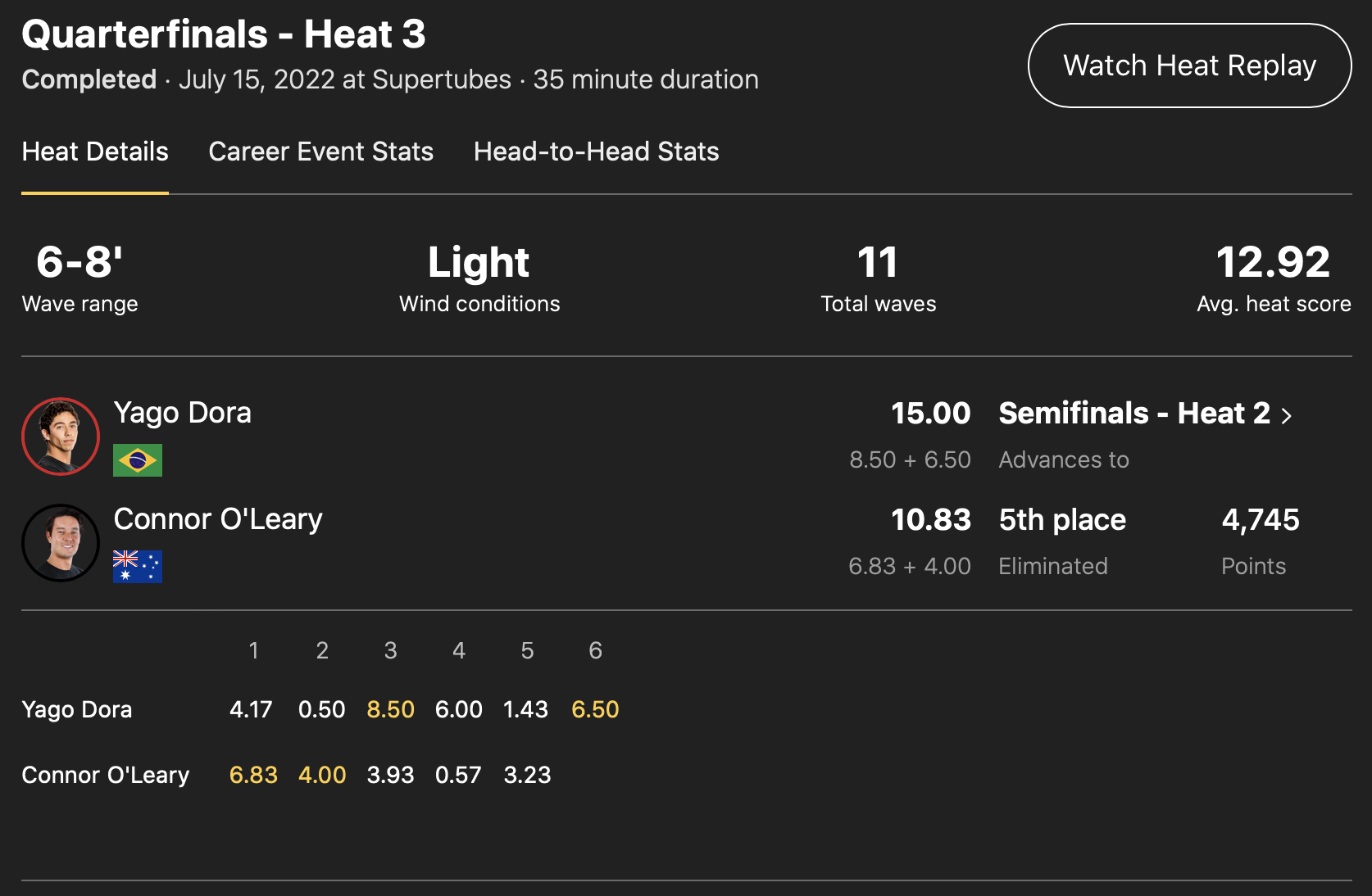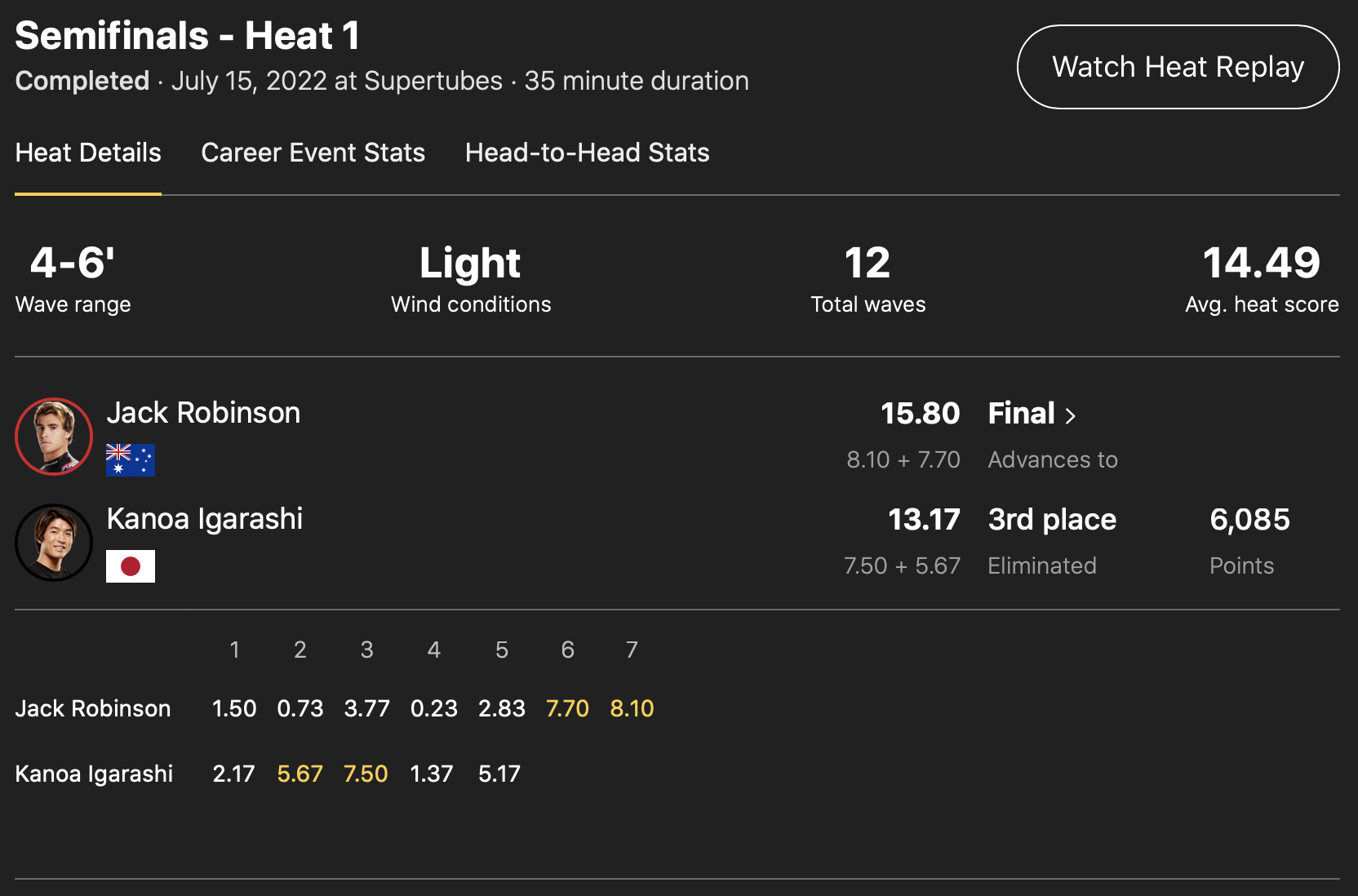 クォーターファイナルのヒート2では五十嵐カノアがワールドチャンプItalo Ferreiraと対戦。ヒート中にリーシュコードが切れてしまうハプニングに見舞われた五十嵐カノアだったが、沖に戻って掴んだ波で8.33ptを叩き出して見事に逆転!エクセレントスコアにエクセレントスコアを重ねる非常にハイレベルな戦いを制してラウンドアップを果たした。