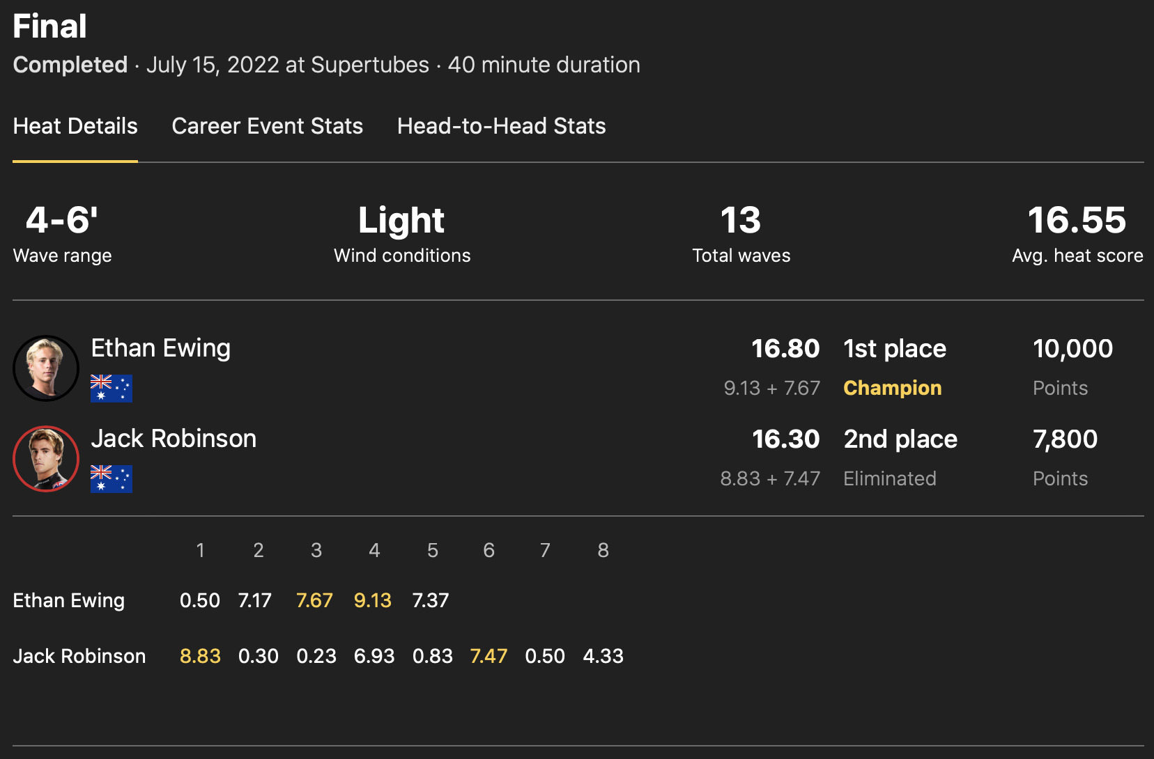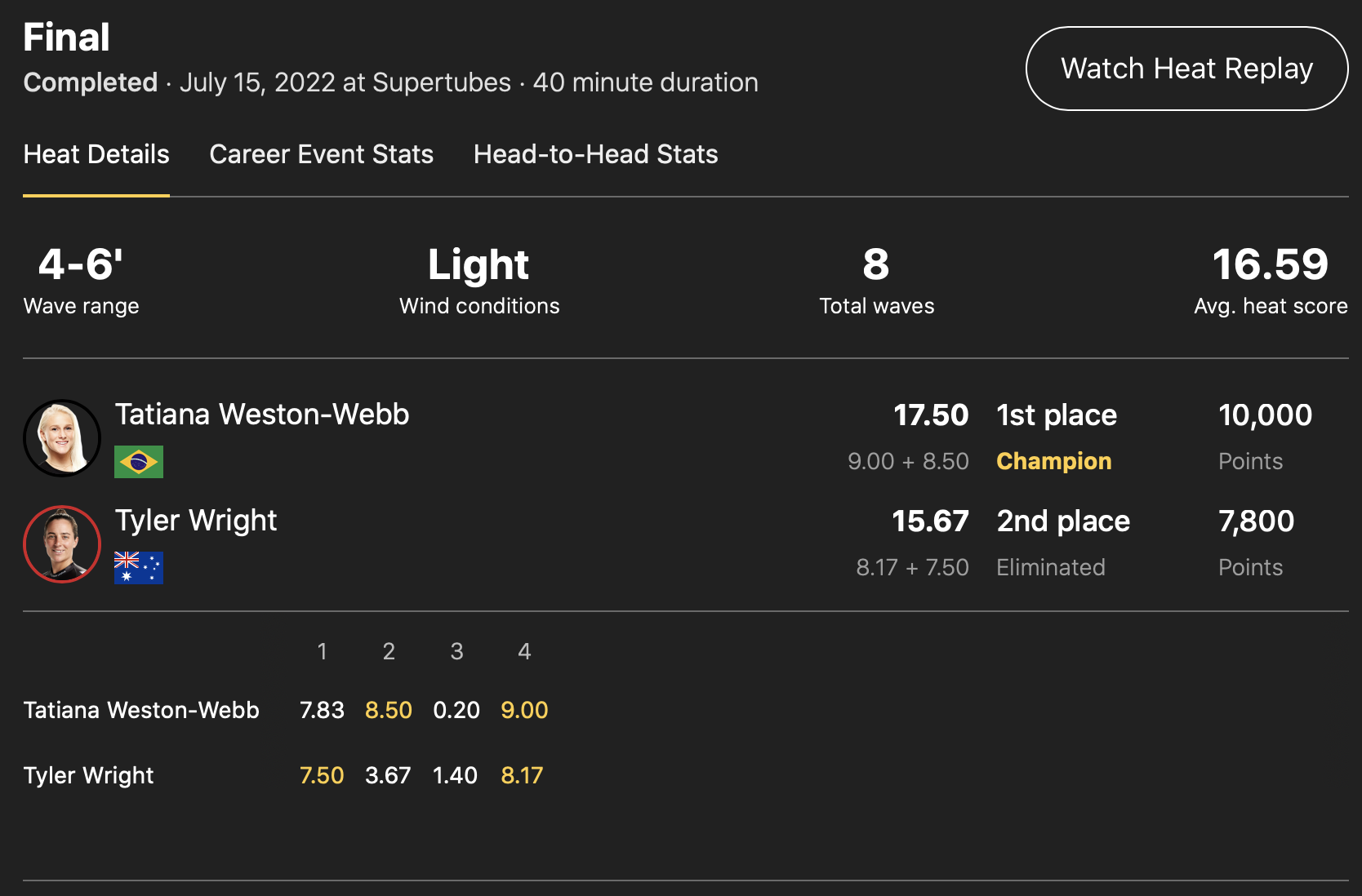 セミファイナルのヒート1でJack Robinsonと対戦した五十嵐カノア。ワールドチャンプ決定戦となるWSL FINALS出場可能なCTランキングトップ5に食い込むためにも、ここでもさらなる快進撃に期待が掛かったが、絶好調なJack Robinsonの勢いを止めることができず、ここで敗退。3位という結果で今大会を終えた。今大会の結果により五十嵐カノアはCTランキング6位のポジションとランクアップならず。タヒチのチョープーを舞台に現地時間の8/11(木)よりコンテスト期間に突入するCT第10戦”Outerknown Tahiti Pro”での勝負の行方から目が離せない状況となっている。