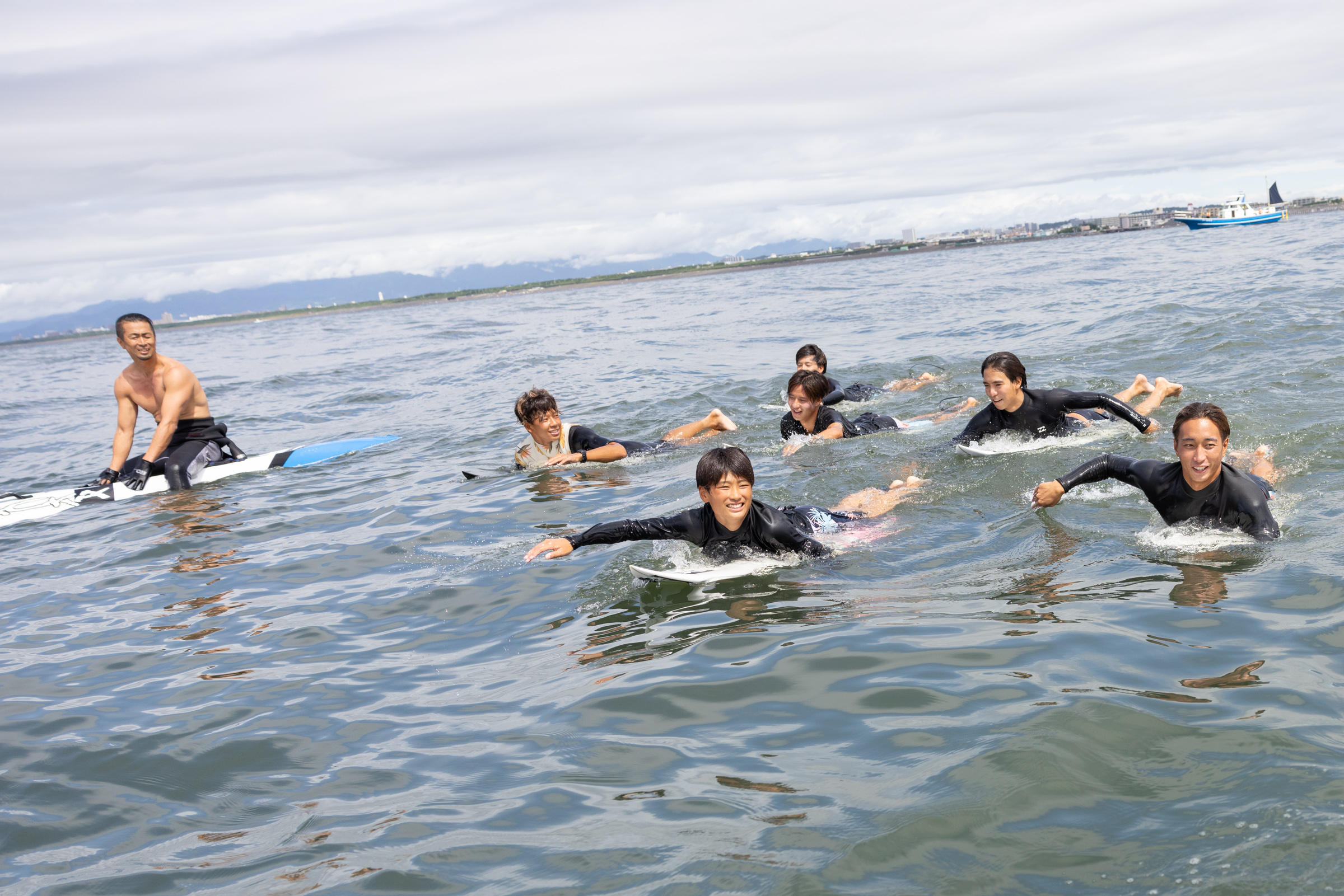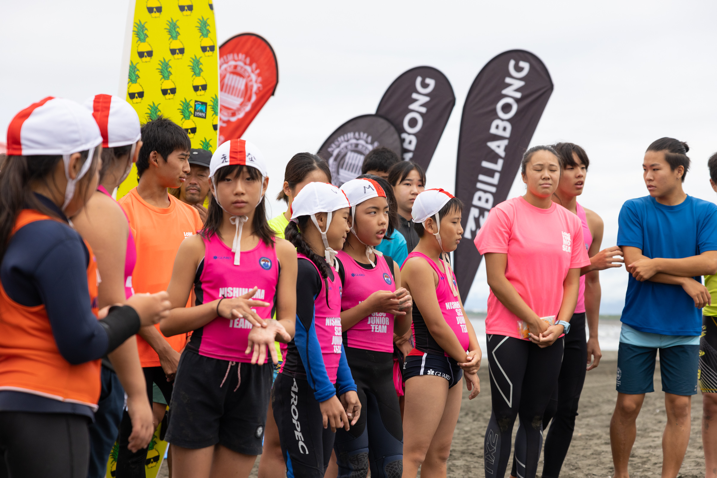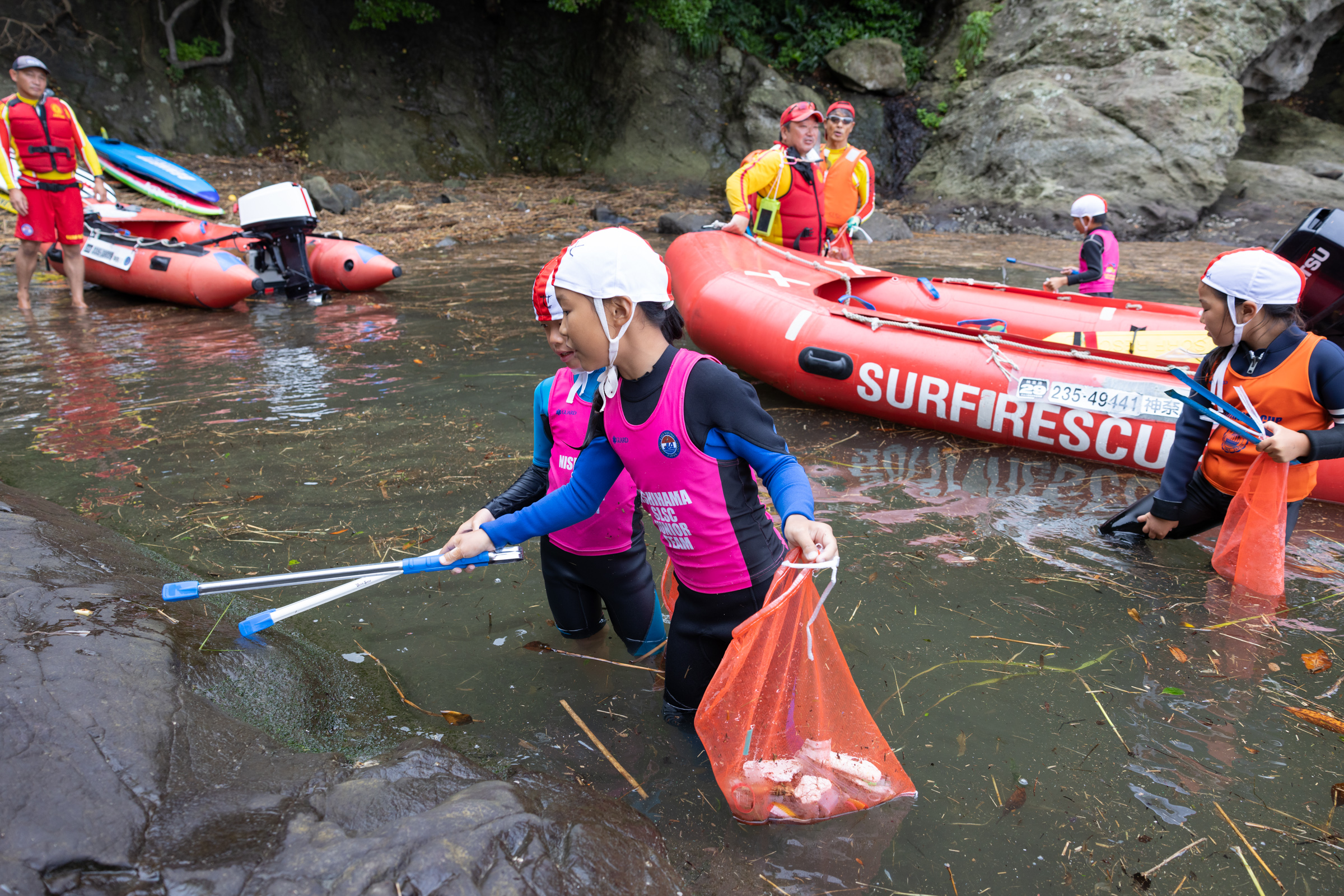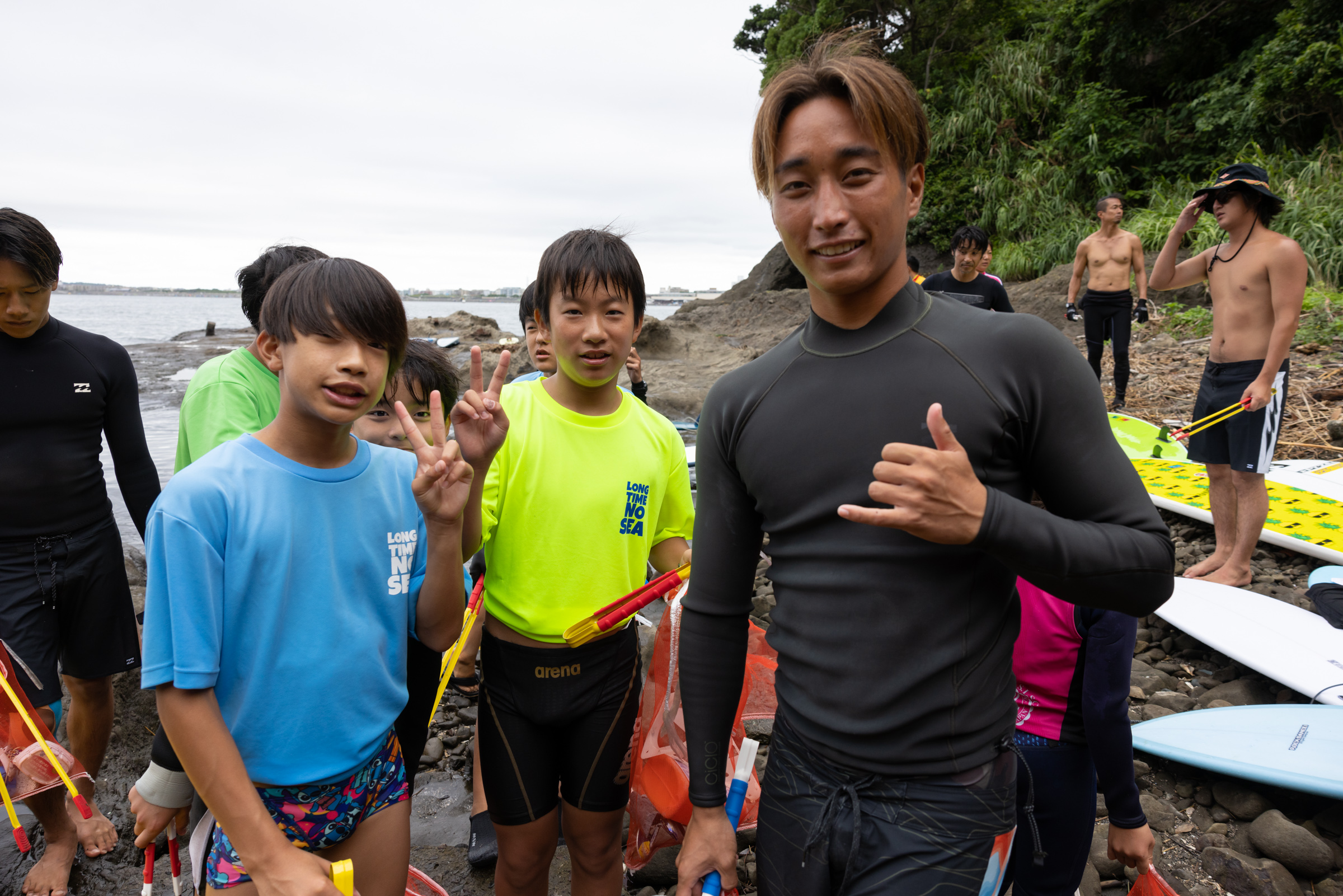 当日は子どもから大人まで総勢80名ほどの参加者と共に松岡慧斗、中村拓久未、鈴木仁、安室丈、古川海夕、小笠原由織、矢作紋乃丞、高井汰朗、近藤義忠といったBILLABONG JAPANのライダーたちと、浜地沙羅さん、上野凌さん、園田俊さんといった日本を代表するライフセーバーたちがオーシャンクリーンに参加。