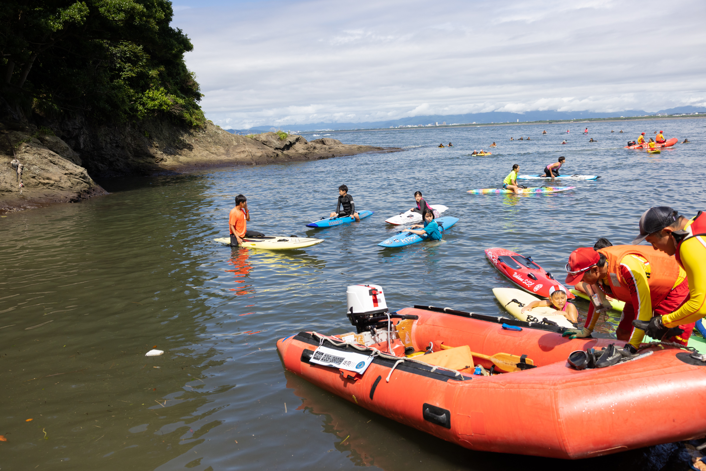 パドルボードやサーフボードを使わないと行くことが困難な江ノ島の磯場で海洋ゴミを拾う清掃活動を行なった。