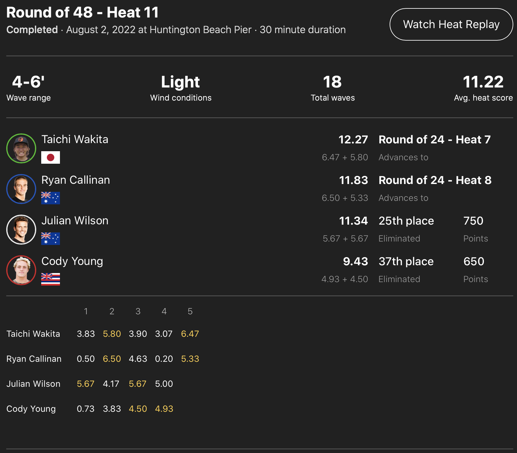 注目の日本人選手たちの活躍は、ヒート11に出場を果たした脇田泰地が、終了間際に6.47ptを叩き出して逆転を果たし、CTサーファーのRyan CallinanとJulian Wilsonを抑えて見事1位でラウンドオブ24へ進出!!